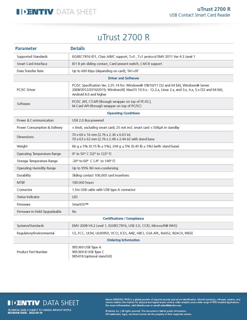 FULLY COMPLIANT – Complies with all major industry standards, including ISO/IEC 7816, USB CCID, PC/SC, and Microsoft WHQL. As well as, EMV 2011 Ver 4.3 Level 1 and GSA FIPS 201. SEAMLESS INTEGRATION – With Identiv-specific SmartOS you’ll get easy, complete support of all major contact smart card ICs and technologies in one simple reader. UNIVERSAL COMPATIBILITY – Works with virtually all contact chip cards and PC operating systems, including Windows, MacOS, Linux and Android. FAST AND CONVENIENT- Shorten transaction time with a reader that’s optimized for speed. It’s ultra-compact and robust design is streamlined for mobile operation, making this reader the best choice for convenience, security and reliability. STRONG SECURITY – Ideally suited for use in high-security federal government applications, online banking and credit card payment apps, Windows authentication and Single Sign-On (SSO), Network login, and much more.