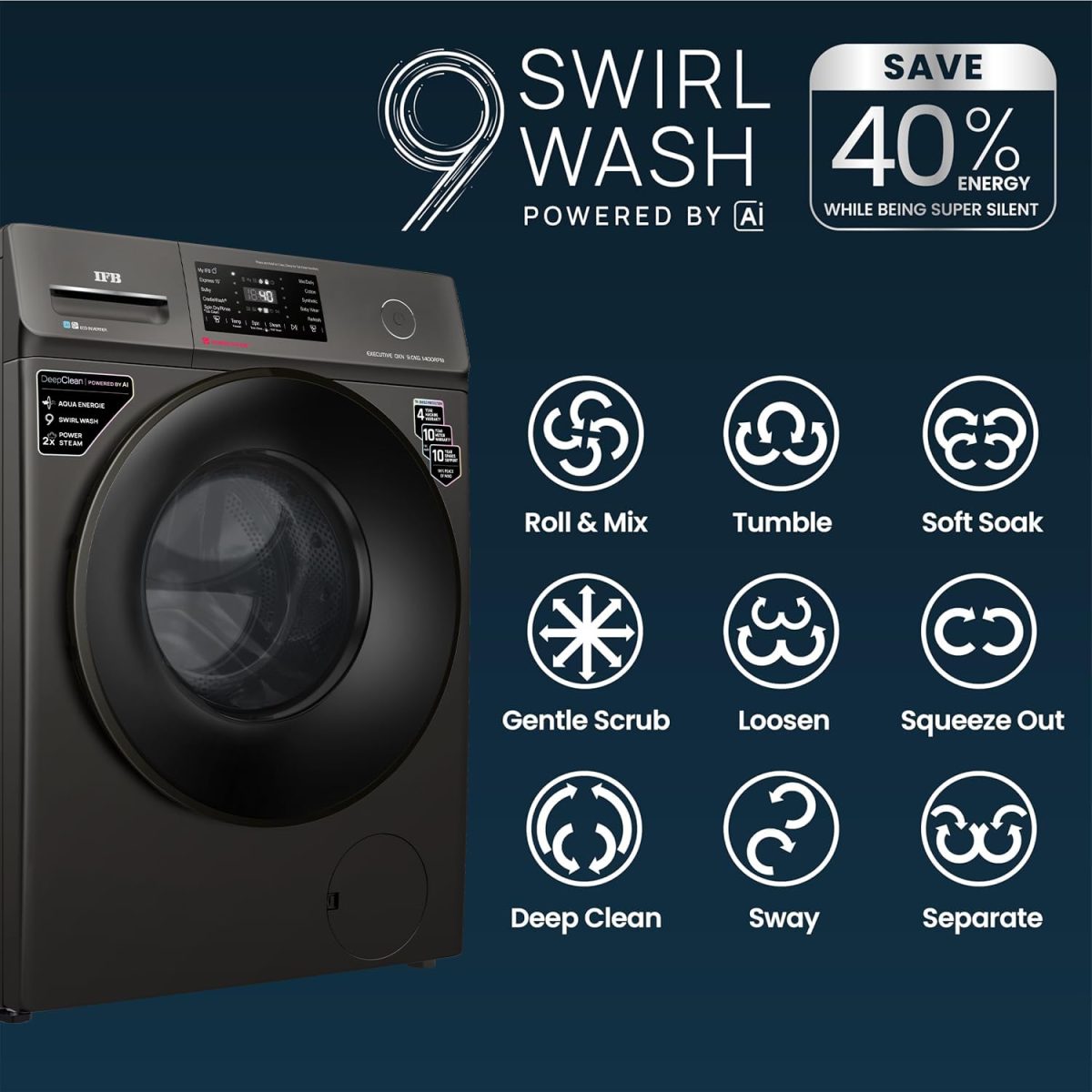 Key Features: AI Technology, Eco Inverter Motor, Power Steam Cycle For Power Cleaning, Aqua Energie Device For Water Softening, Better Detergent Action & Color Protection, Cradle Wash For Delicates, Time Saver: Saves Water, 9 Swirl, Laundry Add, Quick Express Wash