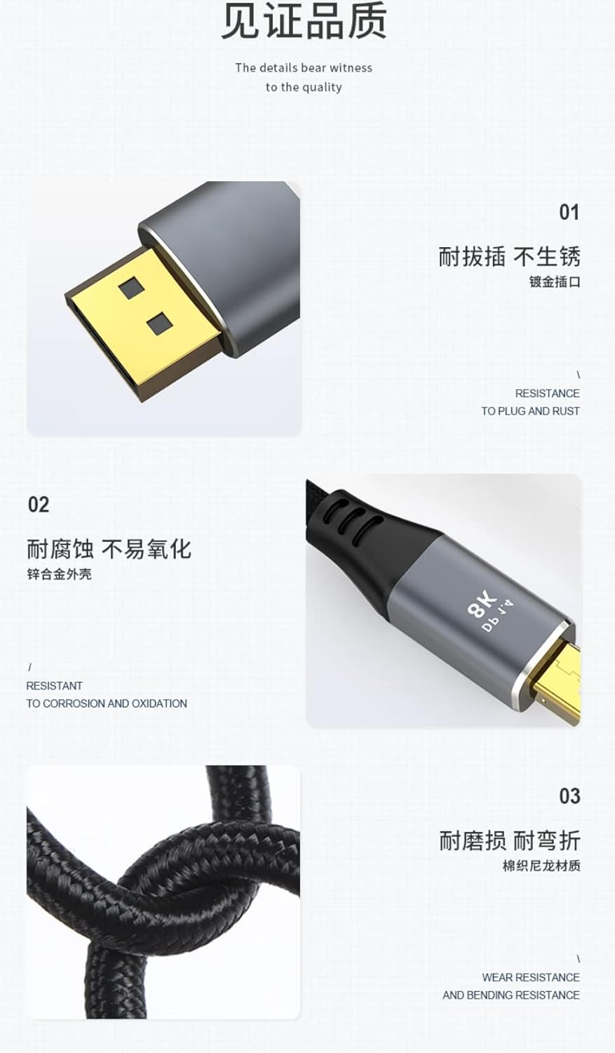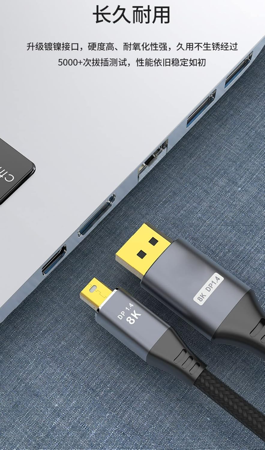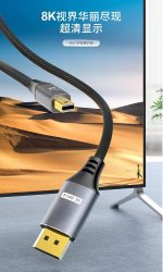 8K Displayport Cable Support 8K@60Hz 4K@144Hz RGB:4:4:4 Gbps:32.4 HDR 3D This Mini DisplayPort to DisplayPort 8K Bi-Directional Cable ,this Cable is widely used both from Mini DisplayPort(DP Alternate Mode Support)Laptops to your displayport displays and from DisplyPort Computers to your Mini DisplayPort Displays(the display must be with Mini DisplayPort). With our Cable, you can easily project on HDTV, large screen monitors and projector screens,In order to further meet your requirements for meeting, home theater, home office, games and other scenes through external displays.This cable Max Support 8K(7680*4320) Ultra High Definition Resolution,It supports 8K@60Hz 4K@144Hz Refresh Rate Resolution: 8K@60Hz, 5K@60Hz, 4K@144Hz, 4K@120Hz, 2K@240Hz Bandwidth: 32.4 Gbps (HBR 3) Video: HDR10, Dolby Vision, HDCP 2.2, 10-bit Deep Color,3D Audio: Dolby Atmos, 32 Audio Channels Gaming: G-Sync, Free Sync, DSC 1.2, FSC, VRR Backward Compatible: DisplayPort 1.3/1.2/1.1/1.0 Plug and Play