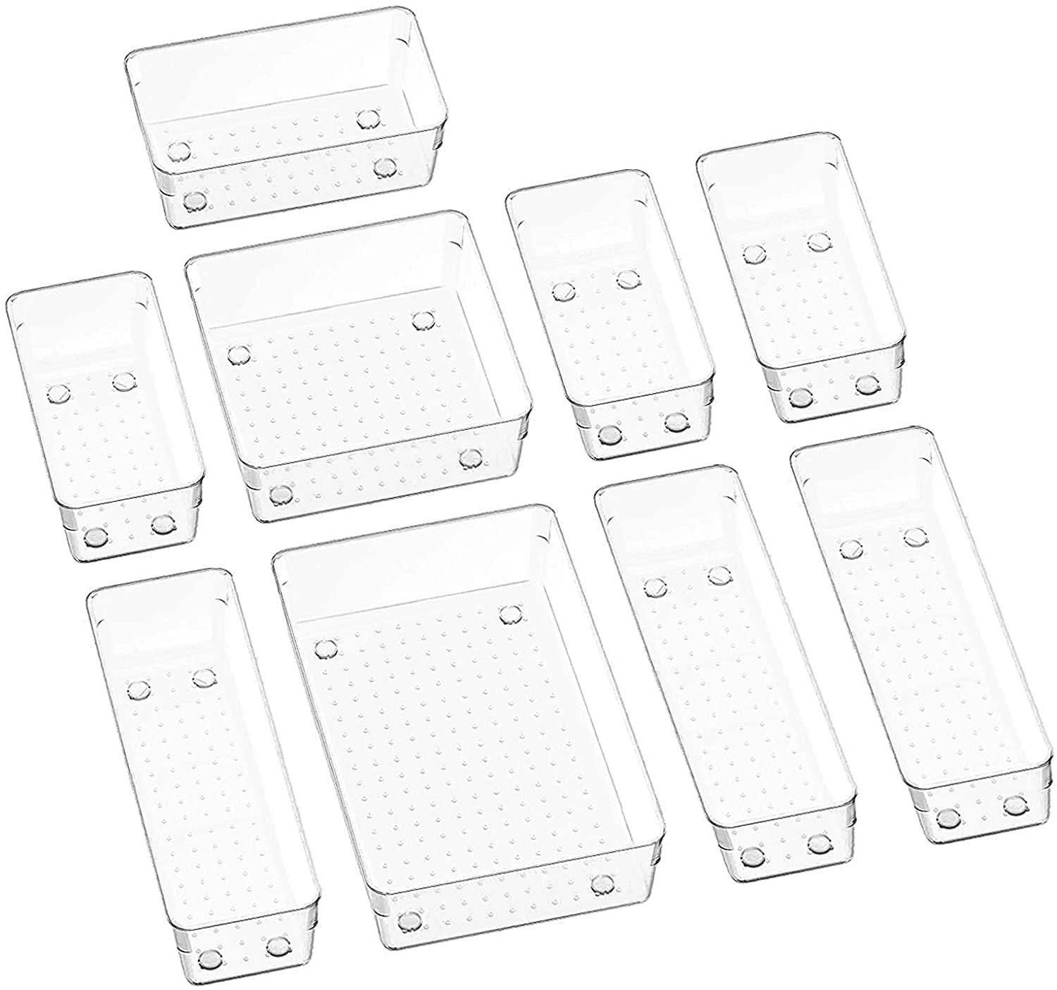 CUSTOMIZE LAYOUT AND HIGH QUALITY MATERIAL – 9 drawer trays in 4 different sizes allow you to customize the layout to fit any size drawer or specific need. Made of durable plastic, clear design can match almost any decor and make it easy to see your stuff and access what you want quickly, convenient for use.