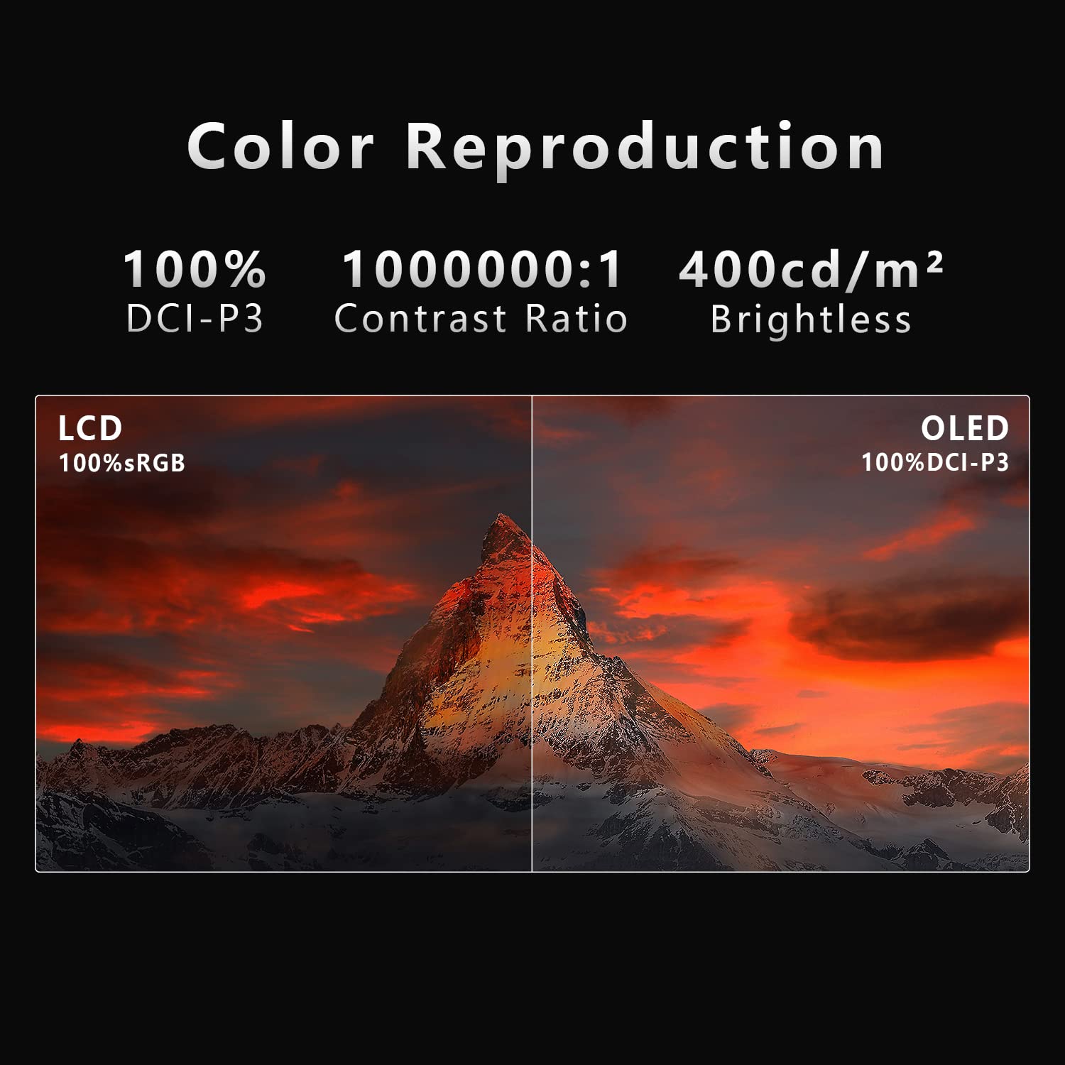 Portable Monitor with OLED Technology, New Experience – 13.3 inch 1080P IPS OLED monitor provides a bright, colorful and immersive viewing experience. You are watching movies or games on your portable monitor for an amazing, realistic picture with low latency. High color gamut 100% DCI-P3, 100000:1 contrast ratio, 400nits brightness, more vivid