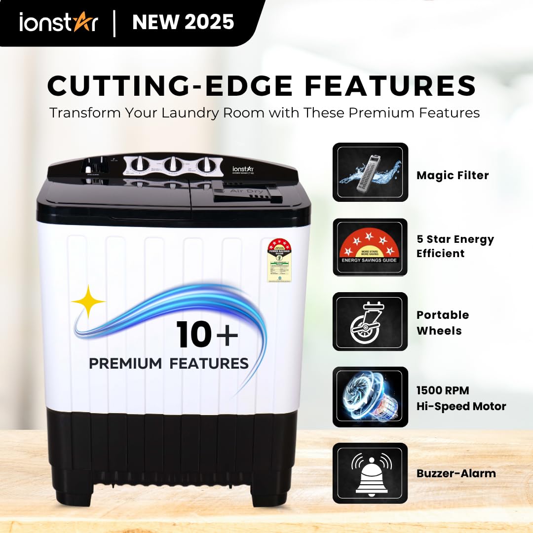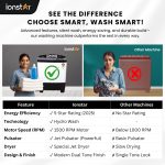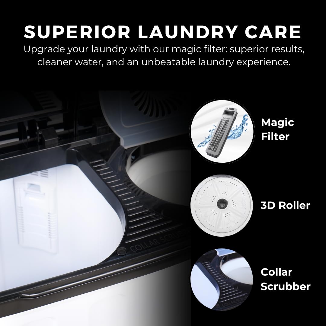 10+ PREMIUM FEATURES : Featuring alarm system, portable wheels, Magic Lint Filter, Improvised Collar scrubbers , Elegant Transparent Lid and so much more