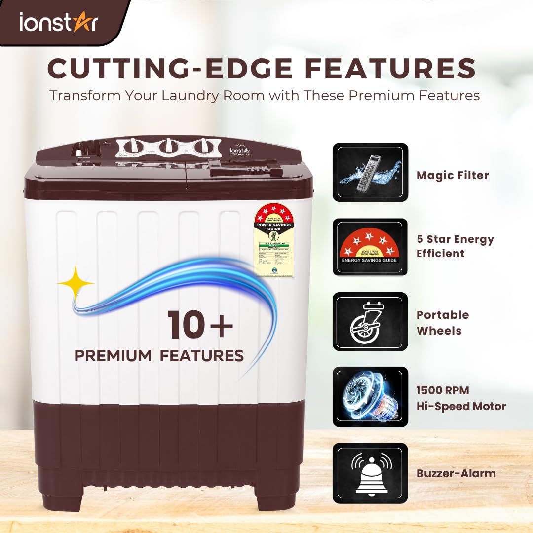 10+ PREMIUM FEATURES : Featuring alarm system, portable wheels, Magic Lint Filter, Improvised Collar scrubbers , Elegant Transparent Lid and so much more