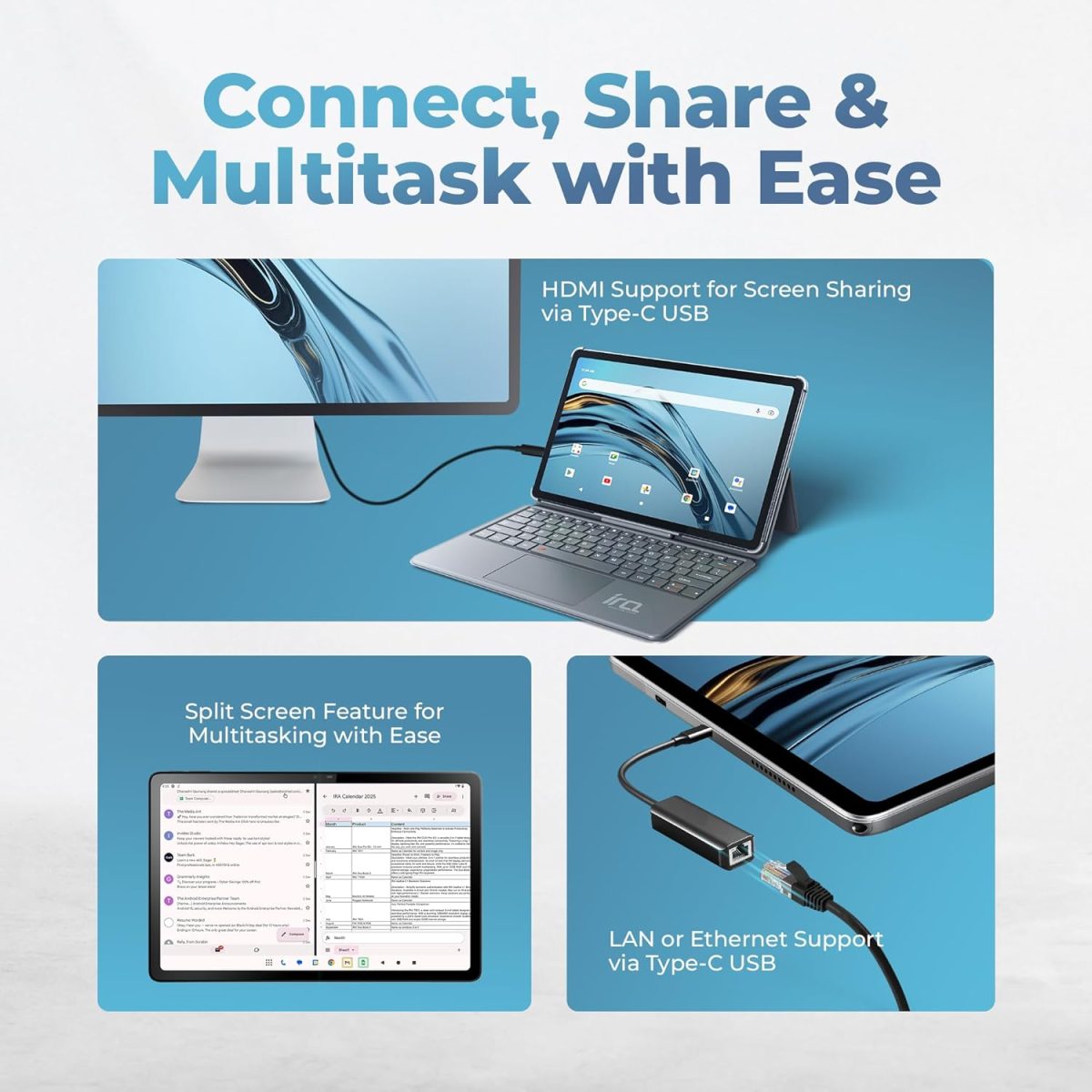 USB and OTG Functionality: Dual USB ports for charging and OTG support, enhancing connectivity and usability. HDMI and LAN Support via Type C USB: Equipped with HDMI for external display sharing and LAN support for wired internet connectivity.