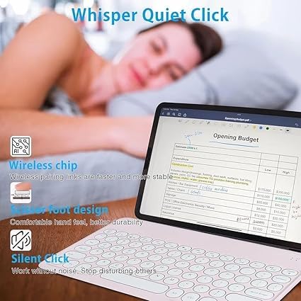 The square chocolate keycaps, scissor-structured keys, small external keyboard, and mute mouse, allow you to type quietly on your tablet, iPad, iPhone, smartphone, etc., and provide you with a comfortable and pleasant typing experience