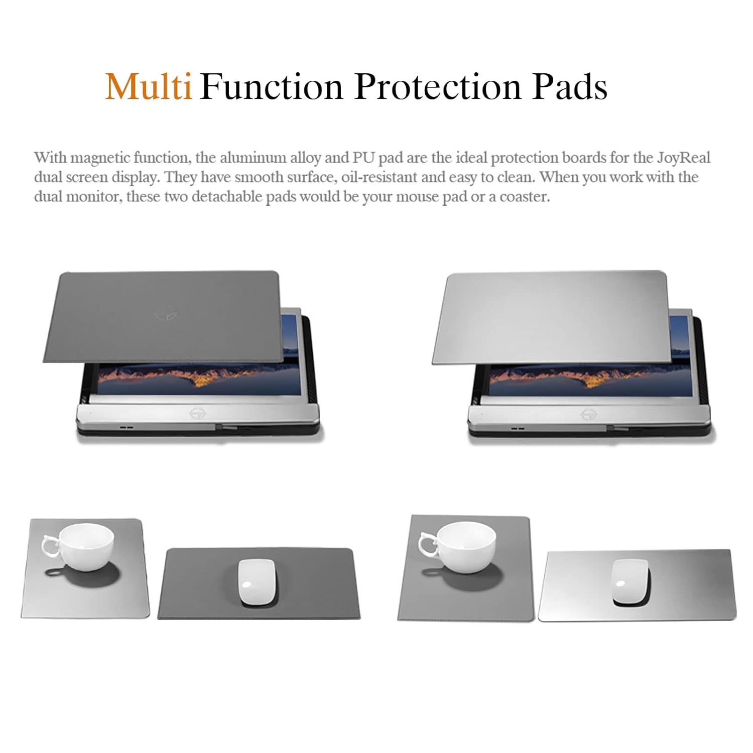 【Multi-function protection pad】 With magnetic function, the aluminum alloy and PU pad are the ideal protection boards for the JoyReal dual screen display. They have smooth surface, oil-resistant and easy to clean. When you work with the dual monitor, these two detachable pads would be your mouse pad or coaster.