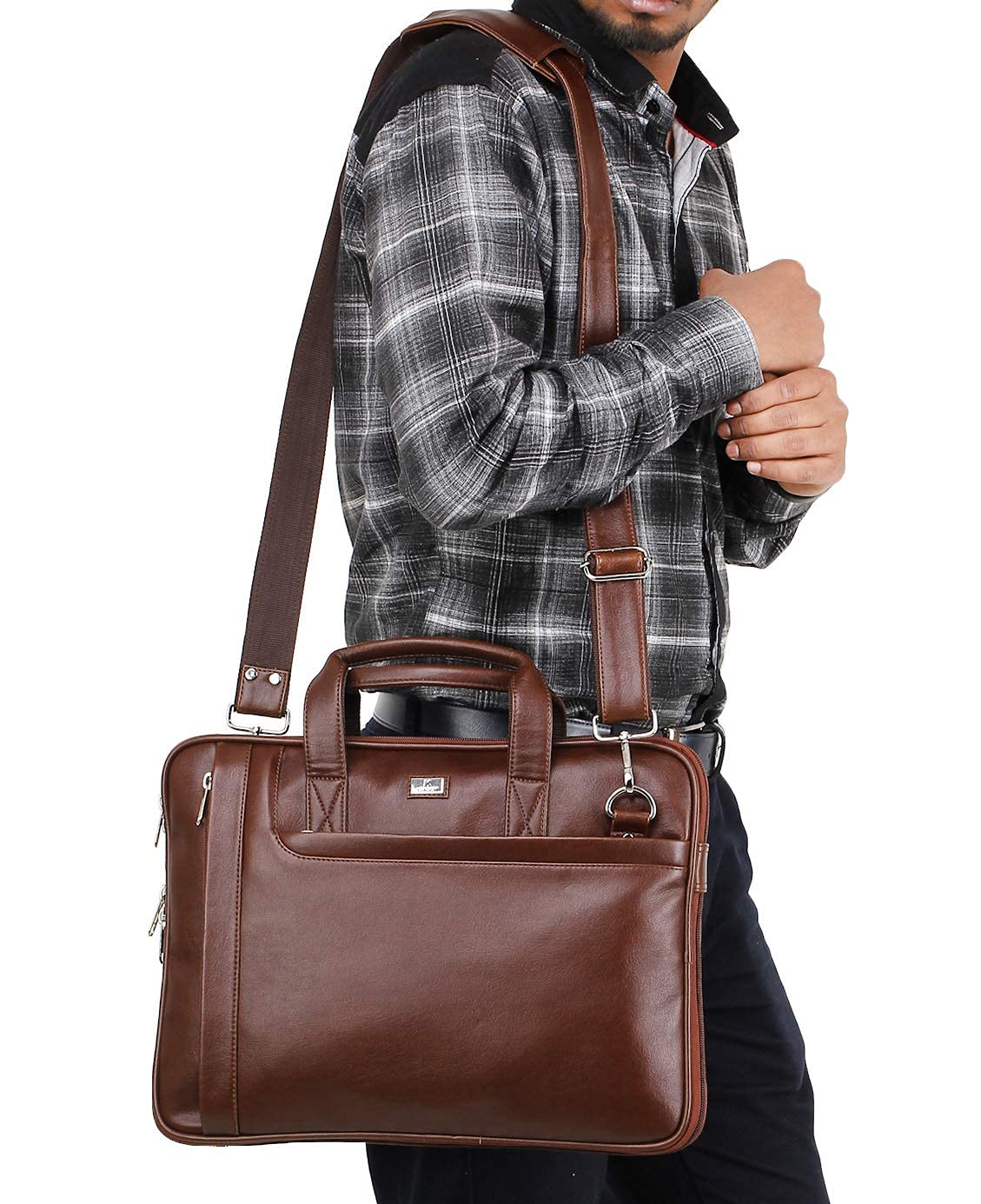 Lightweight yet durable, the K London Unisex (For Men & Women) 14 inches Premium Laptop Macbook Lenovo Think Pad Shoulder Bag carries a laptop plus other everyday business essentials, equipment, accessories and more all in one place, neatly organized and perfectly portable. The case fits laptops up to 14 inches inside a thick padded compartment keeping your laptop safe from any external shock. This elegant case is handcrafted from premium Genuine Leather. It comes with an adjustable-detachable padded shoulder strap and 4 zipper pockets (for iPad, cell phone, pens, documents, wallet, keys etc.) .Designed for both men and women, this unisex bag is crafted from high-quality vegan leather in a sophisticated tan shade. With a slim profile, it’s tailored to accommodate laptops and MacBooks up to 14 inches, providing secure protection during your commute or travel. The thoughtfully designed shoulder messenger bag combines elegance with practicality, making it an ideal companion for office settings and beyond. The interior offers ample space for your laptop, documents, and essentials while maintaining a slim silhouette. The vegan leather exterior exudes a timeless charm, and the adjustable shoulder strap ensures a comfortable fit for all. Stay organized on the go with dedicated compartments that keep your belongings within easy reach. Whether you’re heading to work, business meetings, or coffee shops, this bag effortlessly combines utility and fashion, allowing you to make a statement wherever you go.”