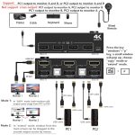 When in copy mode the main screen can be copied to the second screen. When in extend mode, the window from main screen can be dragged to the second output screen.HDMI 2.0 supports 4K (3840 x 2160 @ 60hz) resolution, downward compatible. If monitor is not displaying properly, try reduce resolution.This dual monitor HDMI KVM switch can control 2 computers to share 2 monitors by 1 set of USB keyboard & mouse. To make it work properly please connect all USB cables to give enough power.Support physical button control and wired control. Please note that this model not support keyboard hotkey switch way.Allows you to quickly switch to the mode you need anytime and anywhere during the work, improve your work efficiency.