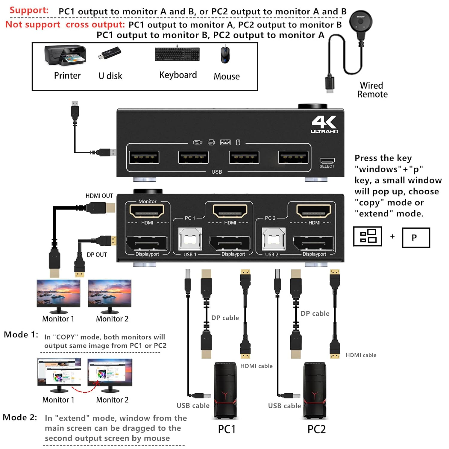 【Support 2 Switching Mode】Support physical button and wired control. Only when your computer supports dual display or multi display, you can use this DP HDMI KVM switch to achieve two computers to share two monitors, please choose extended mode or copy mode in your computer.