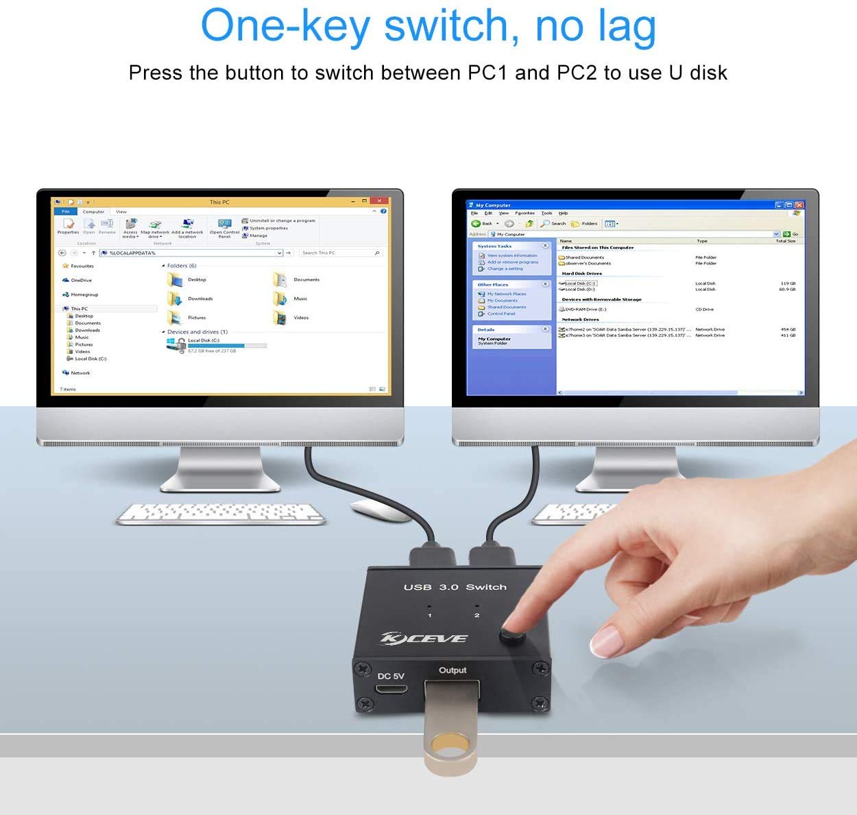 1. With this USB 3.0 switch, 2 PCs or notebooks can share 1 USB devices such as printers, scanners, keyboards, mice, USB flash drives, external hard drives, etc.