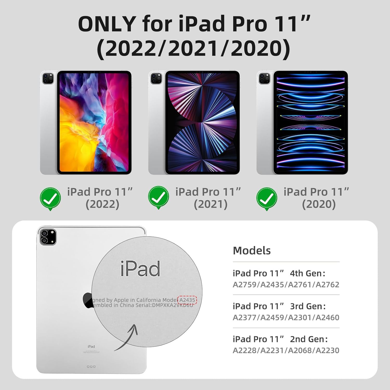 Compatibility : This keyboard case ONLY compatible with iPad Pro 11 inch case for iPad Pro 4th Generation/iPad Pro 3rd Generation/iPad Pro 2nd Generation 2022/2021/2020 (Model Number: A2759/A2435/A2761/A2762/A2377/A2459/2301/A2460/A2228/A2068/A2230/A2231). Please check the exact model of your device before purchasing