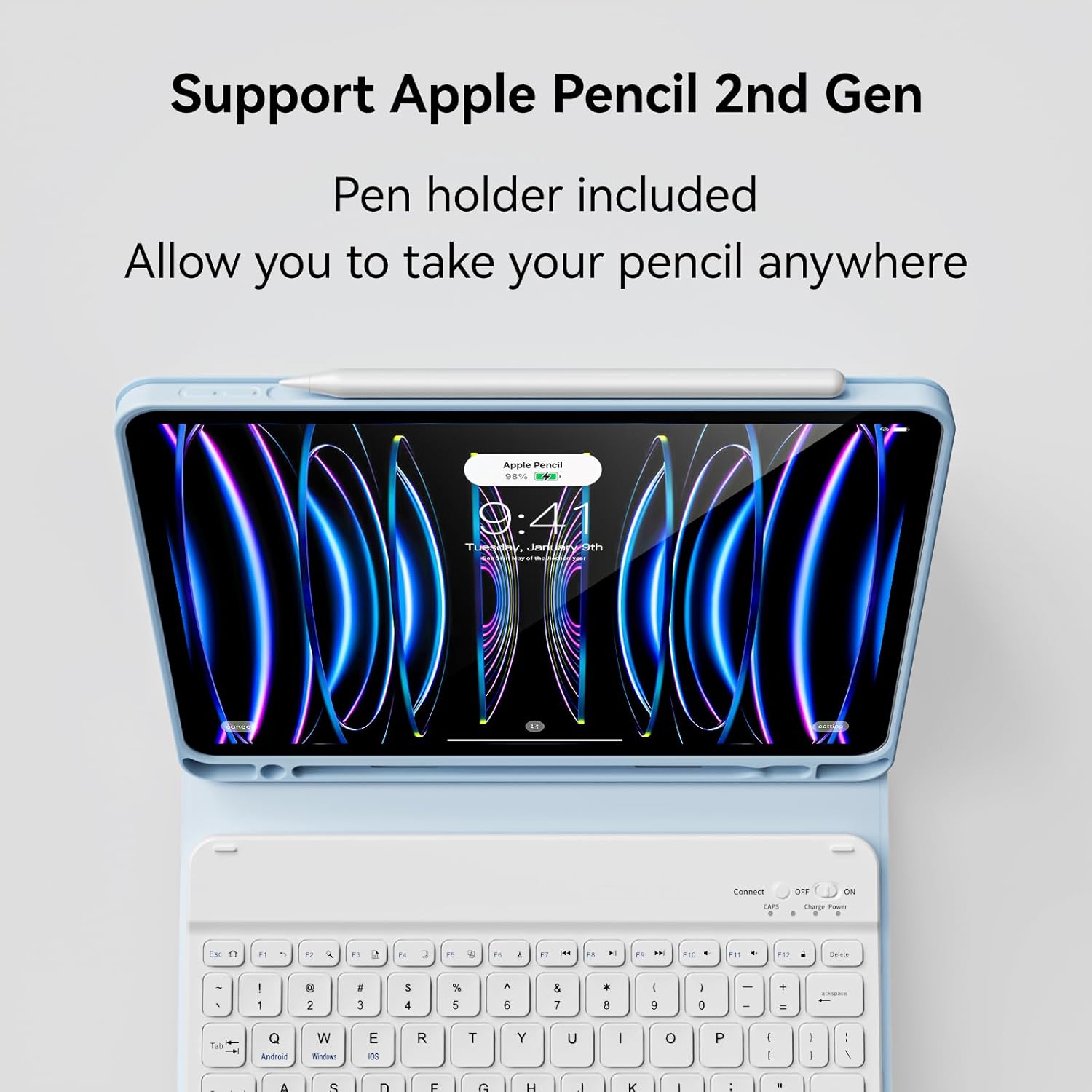 Built-in Pencil Holder : iPad Pro 11 keyboard case built-in iPad pencil holder, cap & adapter slots, easily to carry your iPad pencil with your device. Supports pencil wireless charging in the right side of iPad case, specific pencil slot to place the pen when fully charged, avoids damage to the Pencil’s battery with multiple charges. (Note: iPad pencil, cap & adapter not included)