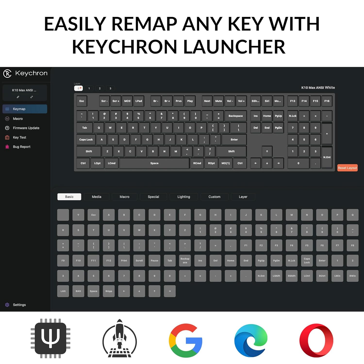 QMK Firmware & Web-Based Launcher App: Powered by QMK open-source firmware, the K10 Max offers robust security and adaptability, guarding your input safety, as everyone can inspect the code. The Keychron Launcher, an intuitive, cross-platform web tool, ensures access to updates and advanced features for a tailored keyboard experience