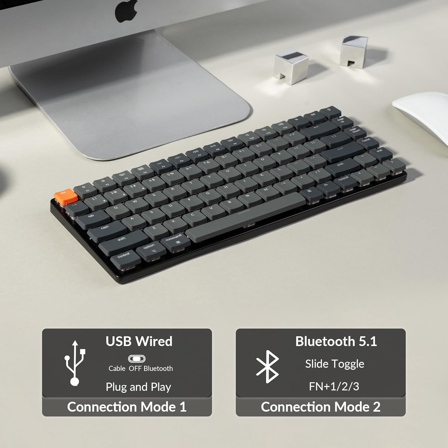 Together with the reinforced aluminum body (plastic bottom frame) make the K3 one of the thinnest and lightweight wireless mechanical keyboards on the market. The K3 also comes with a floating keycap design with a charming white backlight with modern keycap legends to sync with your mood.