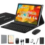 kimlok 2024 Android 14 Tablet, 10 Inch 128GB+8GB+512GB Expandable Octa-Core Processor 2-in-1 with Keyboard and Mouse, 7000mAh Battery, 5G WiFi, Dual Camera, BT5.0
