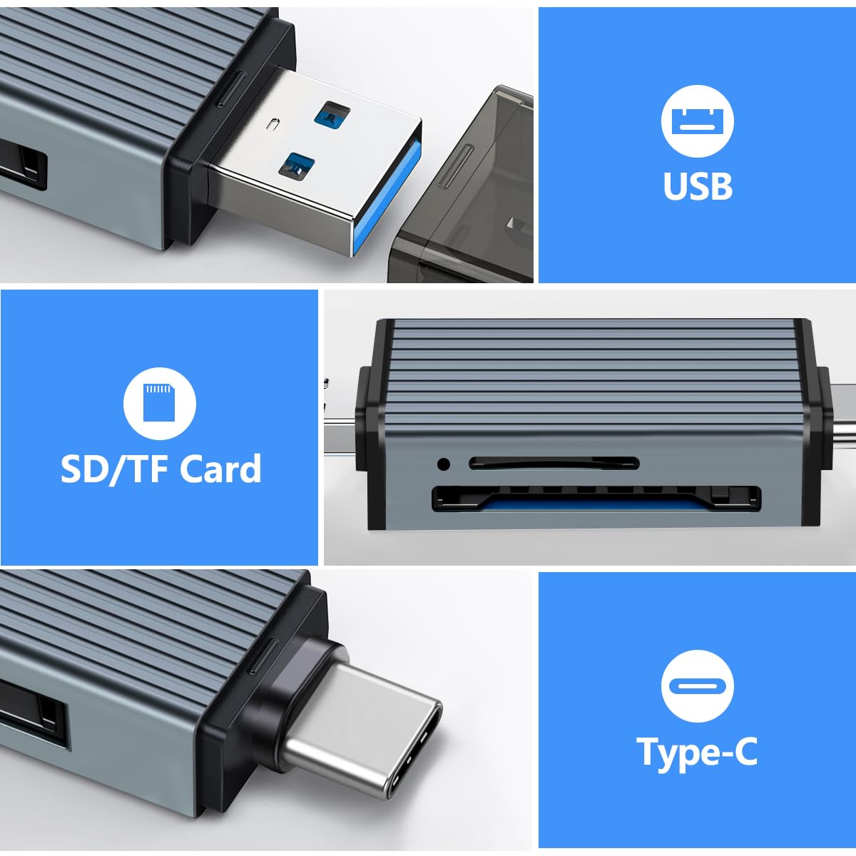 Kinsound 4 in 1 SD & TF Card Reader with Type-C & USB Ports,Portable Memory Card Reader Compatible with TF, SD, SDHC, SDXC, MMC, RS-MMC, Micro SDXC for Computer & Android Phone