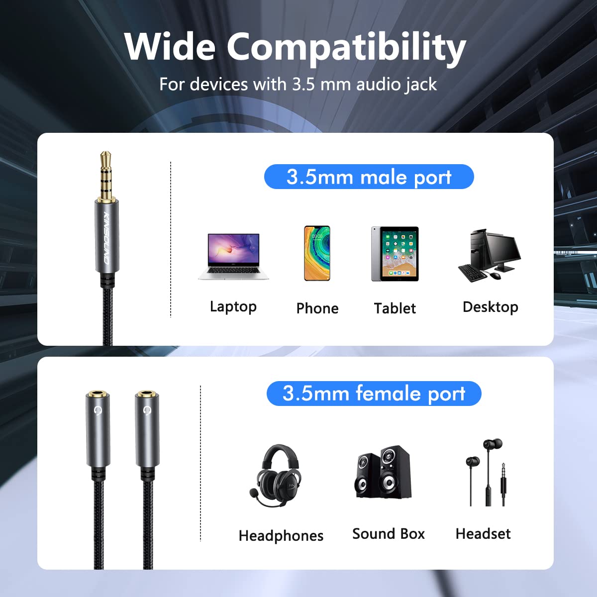 【Headphone Splitter with 2 Audio and Microphone】The Kinsound splitter converts a single 3.5mm male jack into 2 female stereo plugs. Both male jacks have audio and microphone, which is very different from other splitters. The microphone and headphone jacks are combined into one, providing great convenience for customer use.