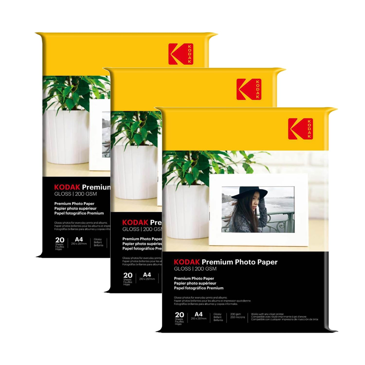 Kodak 200 GSM A4 Glossy Photo Paper – Water Resistant, Pack of 3 x 20 sheets, Compatible with all Inkjet Printers