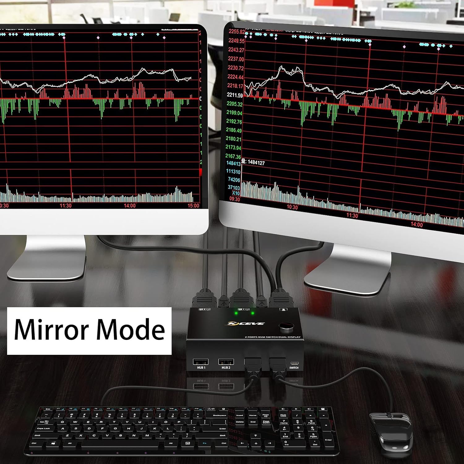 This Dual Monitor HDMI KVM can control 2 PC share 2 monitors by 1 set of USB keyboard & mouse. When in copy mode the main screen can be copied to the secondary screen. When in extend mode, the window from main screen can be dragged to second screen.
