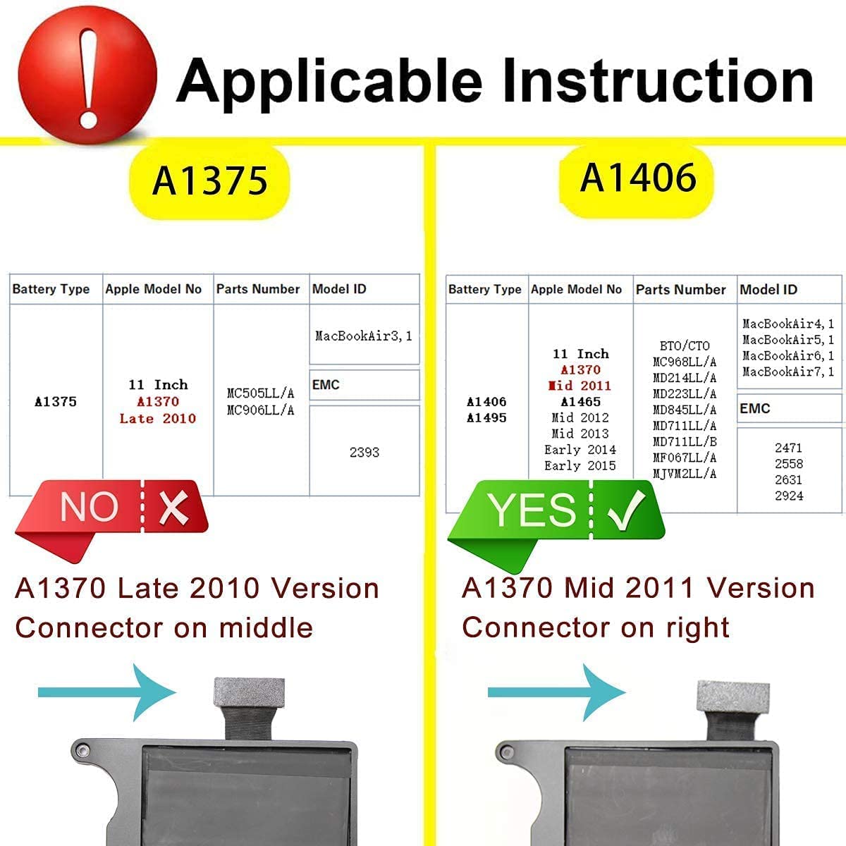 COMPATIBLE MODELS AND P/N’s: This A1406 A1495 battery is compatible with MacBook Air 11 inch A1465 Mid 2012 Mid 2013 Early 2014 Early 2015 Version, A1370 Mid 2011 Version; Compatible P/N: MC968 MC969 MD223 MC506LL MD711 MC965LL Series, 020-7376-A 020-7377-A, 661-6068.