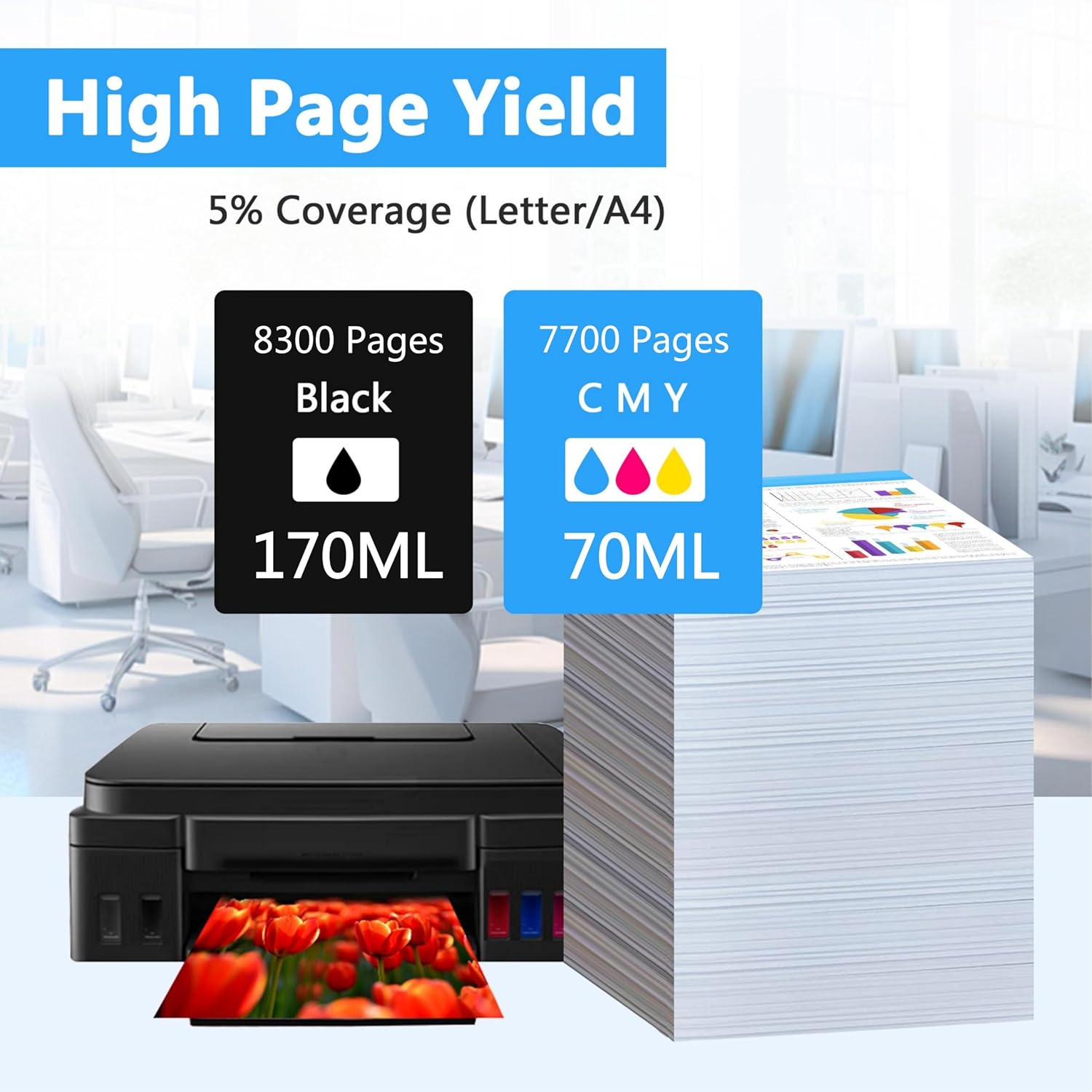High Capacity: Extra-large capacity ink bottle, longer replacement interval. Includes 4 Ink Bottles: Up to 8300 pages per GI-20 black ink bottle in 170ml; 7700 pages per GI-20 Cyan/Magenta/Yellow ink bottle in 70ml (with 5% Coverage of A4 paper).