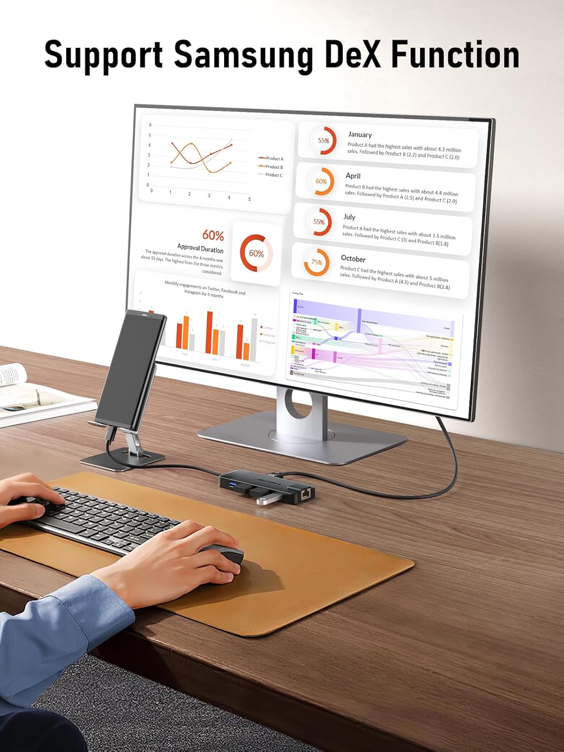 【Support Samsung DeX + Xiaomi Desktop Mode】Imagine when you rush out but forget to take your computer with you, and at this moment you urgently need to use Word to edit documents, Excel to process data, or PowerPoint to create presentations, this amazing product will help you solve the embarrassment. Simply connect it to your mobile phone, and your mobile phone will instantly transform into a powerful computer, enjoying an efficient and convenient mobile office experience. If you are at home, you can also link the mouse and keyboard to play a cozy game or watch a super clear film (Note: mobile phone Type-C interface 3.0 and above is required)