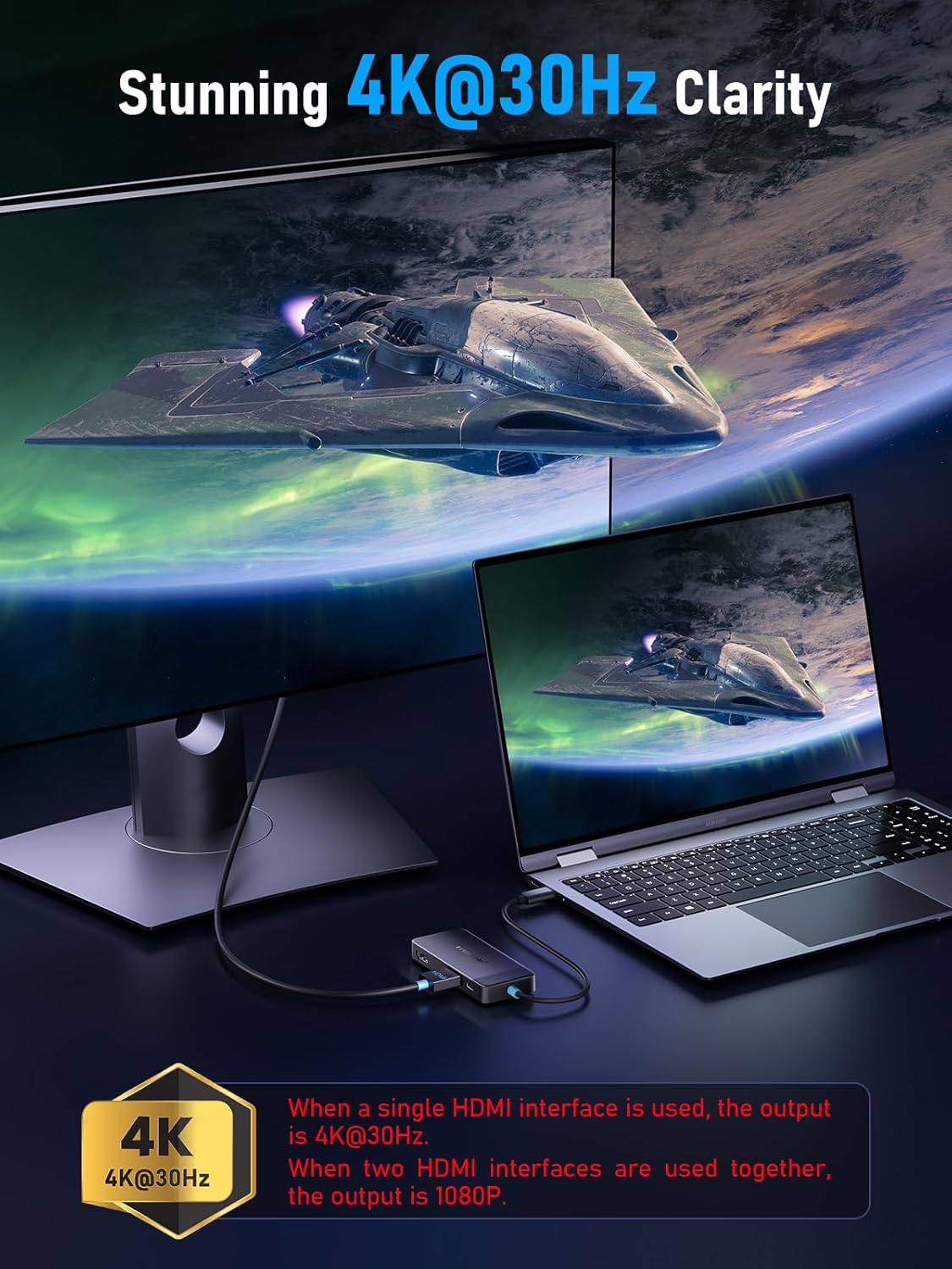 【Dual Monitor Docking Station】The docking station is designed with two HDMI ports, and under Mac system, the mirroring can support dual 4K resolutions, providing greater convenience and possibilities for work and entertainment, and bringing you the ultimate visual experience. Note the display mode differences: Mac OS supports only mirror mode (dual 4K@30Hz, AAA/ABB: same content on external monitors); Windows supports extend mode (triple monitors, ABC: different content on three displays, dual 1080P@60Hz).