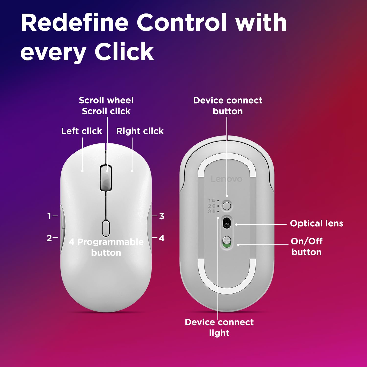 Lenovo 700 Multi-Device Wireless Silent Mouse, Bluetooth 5.3 or USB-A 2.4Ghz, Upto 5million Button clicks, 4000 DPI, Soft Touch Grip, Programmable Buttons, Dynamic Scroll Wheel, Seashell