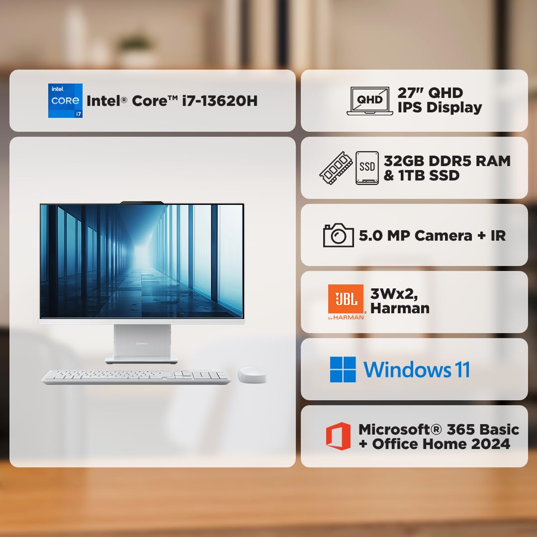 Lenovo IdeaCentre AIO 13th Gen Core™ i7-13620H 27″ QHD Touch IPS (32GB RAM/1TB SSD/Windows11/Office 24/3Wx2 Harman Speakers/Wireless EOS Keyboard & Mouse, Cloud Grey), F0HM00PNIN All-in-One Desktop