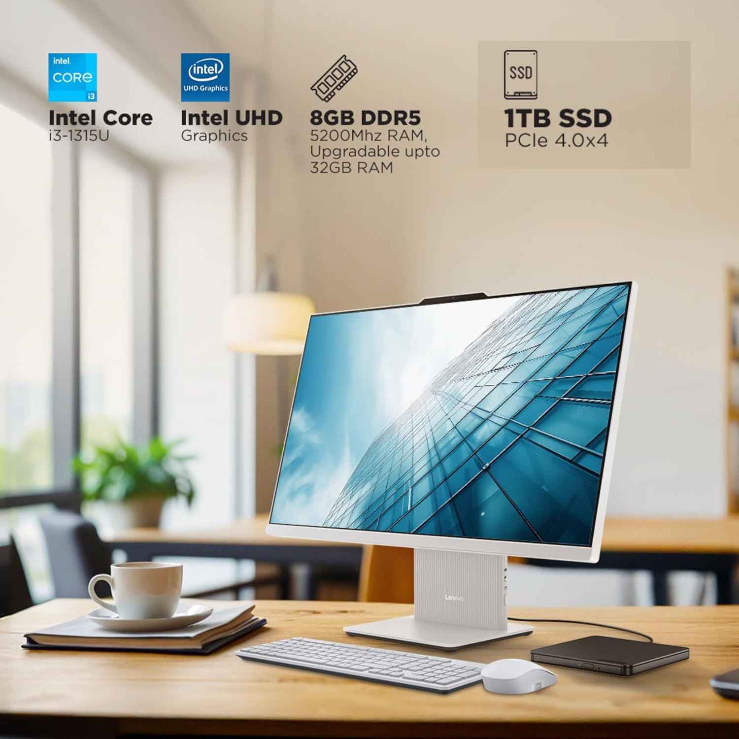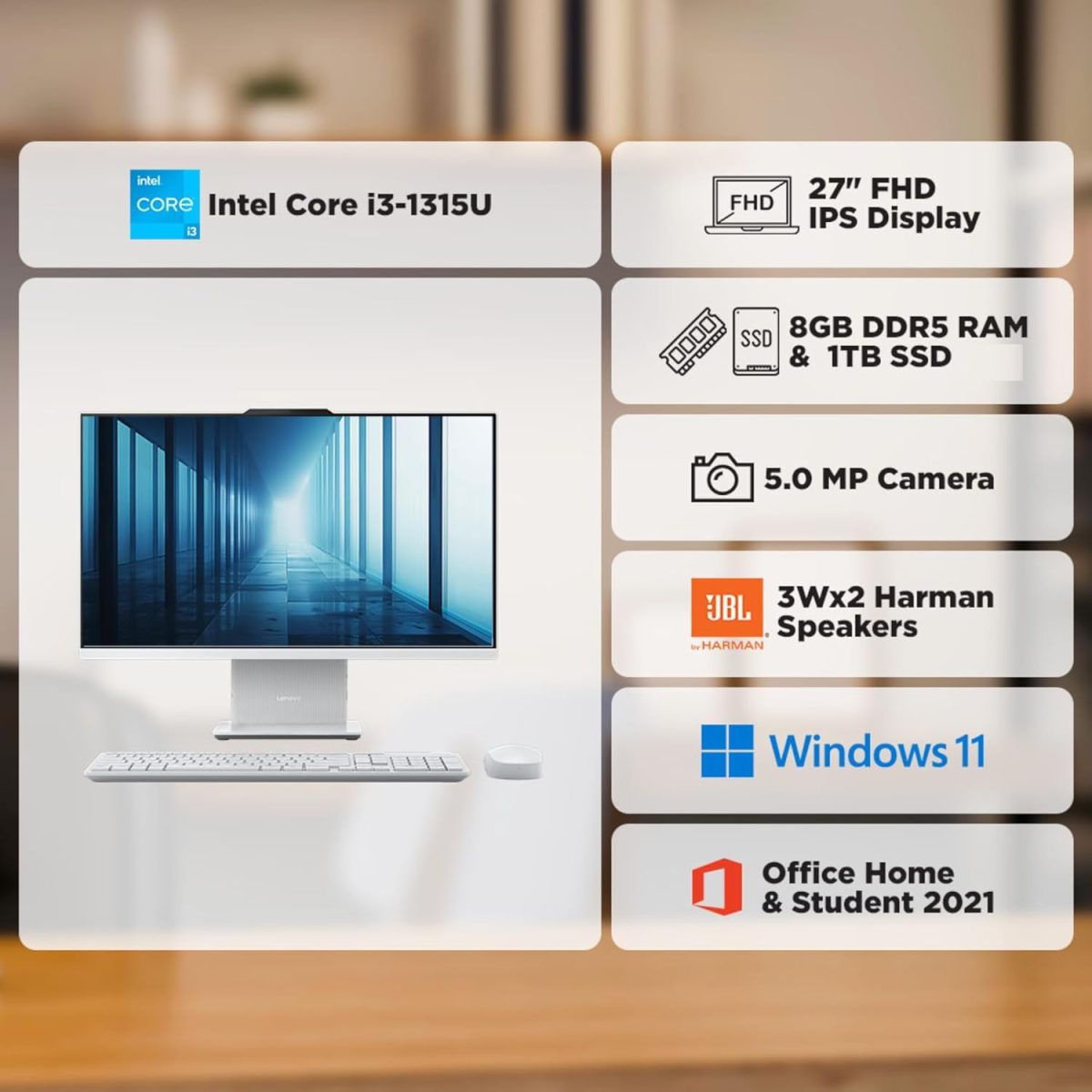 Lenovo IdeaCentre AIO Intel i3-1315U 27″ FHD 3-Side Edgeless All-in-One Desktop (8GB/1TB SSD/Win11/Office 21/3Wx2 Woofer/Alexa/5.0MP + IR Camera/Wireless Keyboard & Mouse), F0HM0066IN