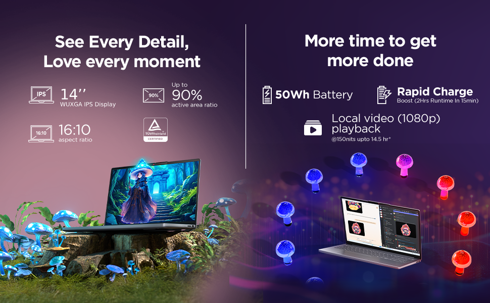 Display: 14″ FHD (1920×1200) | 300Nits Brightness | Anti Glare |TUV Low Blue Light Certified