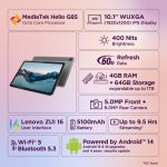Display:- 10.1″ WUXGA LCD IPS Screen | Resolution: 1920 x 1200 | Refresh Rate: 60Hz | Brightness: 400nits | 72% NTSC Processor:- MediaTek Helio G85 (8C, 2x A75 @2.0GHz + 6x A55 @1.8GHz) || WLAN + Bluetooth: Wi-Fi 5, 802.11ac 1×1 + BT5.3 Memory & Storage : 4GB Soldered LPDDR4x | 64GB eMMC 5.1 | Max Storage support: 64GB eMMC 5.1 on systemboard, microSD card, supports up to 1TB Speakers & Camera: 2 side speakers, optimized with Dolby Atmos | Front 5.0MP / Rear 8.0MP Battery: Integrated 5100mAh (Typ.) | Video streaming: 9.5 hr of YouTube streaming, Web browsing: 10.5 hr of Chrome browsing