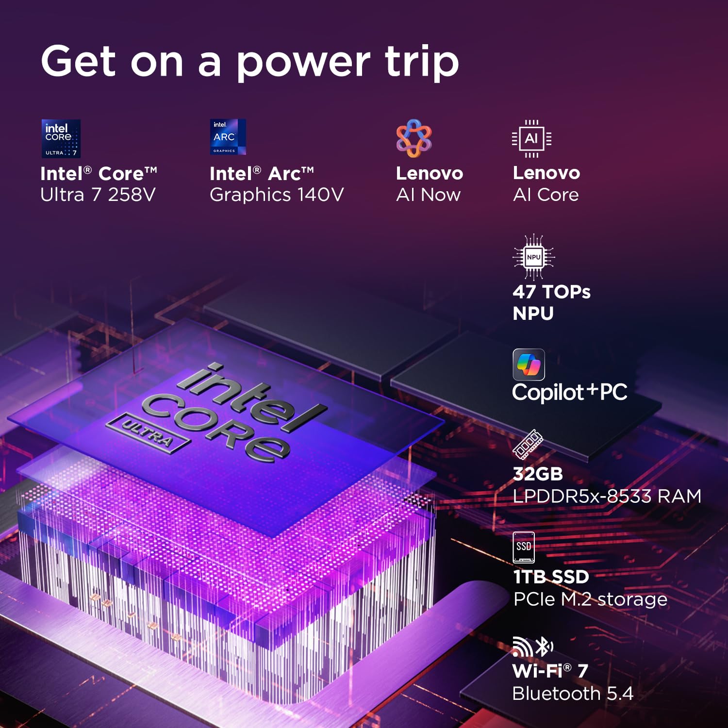 Processor: Intel Evo Core Ultra 7 258V | 8C (4P + 4LPE) / 8T, Max Turbo upto 4.8GHz | 8 Cores | 8 Threads | Cache: 12MB || NPU: Integrated Intel AI Boost, up to 47TOPS