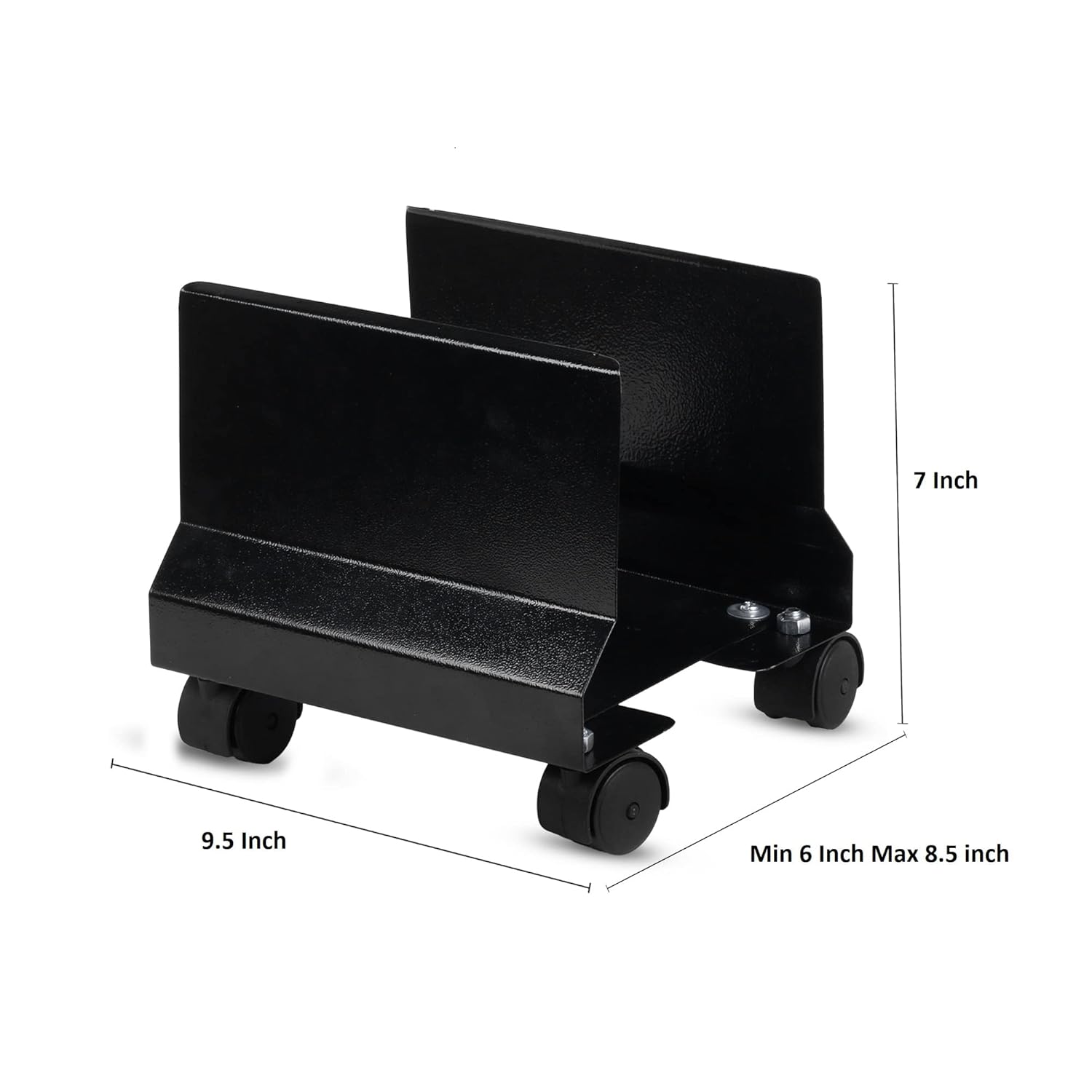 Now, make your CPU more accessible by placing it on this heavy movable Stand which is compatible with all leading brands. SALIENT FEATURES: 1. Universal & adjustable design to fit all sizes of CPUs 2. Length Adjustment mechanism & sturdy and easy locking. 3. Load carrying capacity up to 50 Kgs which is best in class. 4. Lockable wheels to station trolley at one place and. 5. Manufactured in high grade sheet metal steel. 6. Seven way process Powder Coating for Longer life & outstanding Aesthetics. 7. Easy lo lock & operate. IN THE BOX: Trolley/ Stand with 4 twin Wheels. PRODUCT DIMENSIONS: Size Accommodation : (MIN – MAX) : 120 mm – 210 mm