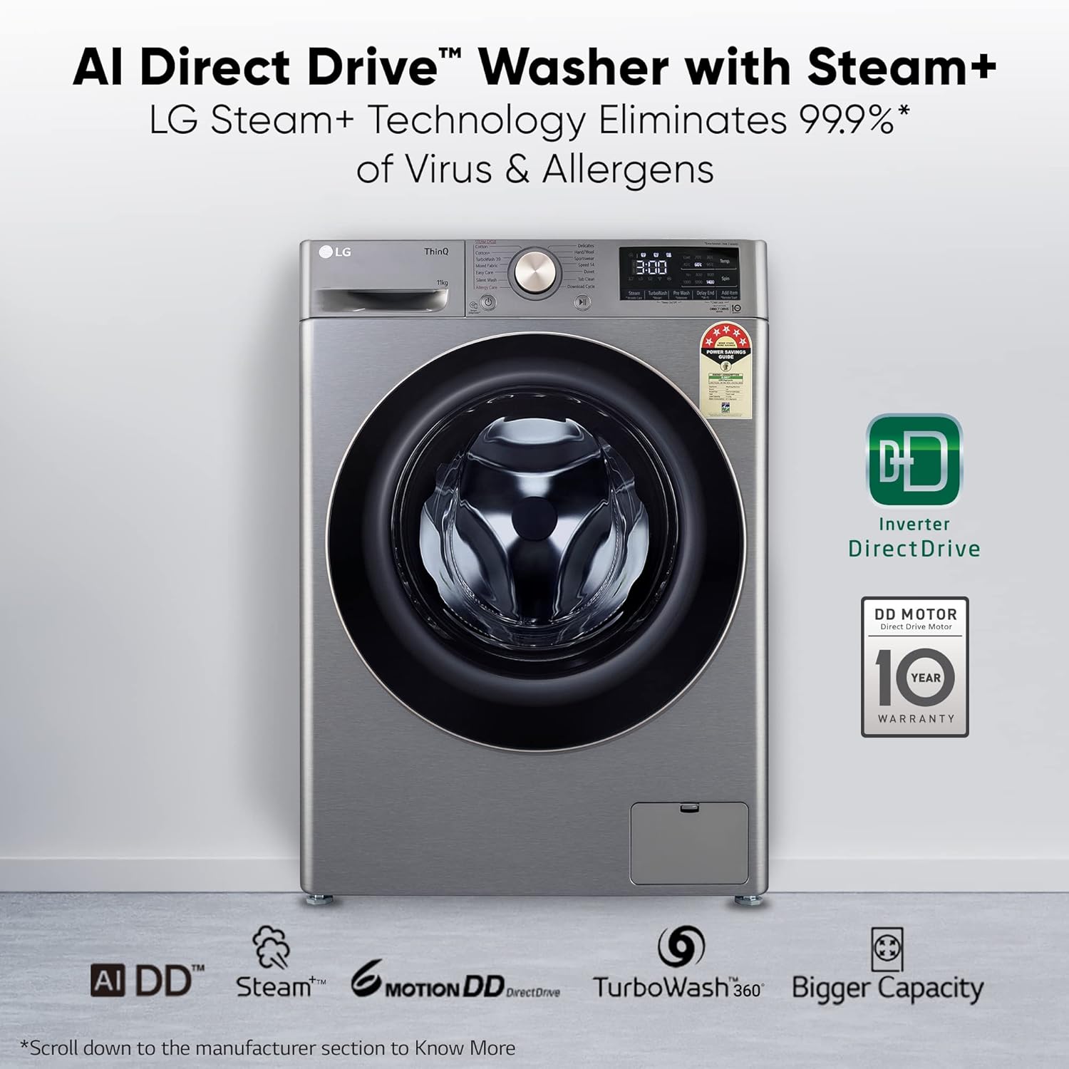 Wash Programs: 14 No. of Programs – Cotton, Cotton+, TurboWash 59, Mixed Fabric, Easy Care, Allergy Care, Baby Steam Care, Delicates, Hand/Wool, Speed 14, Dry Only, Wash+Dry (5 Kg), Tub Clean & Download Cycle | Can be downloaded multiple wash programs using LG ThinQ App