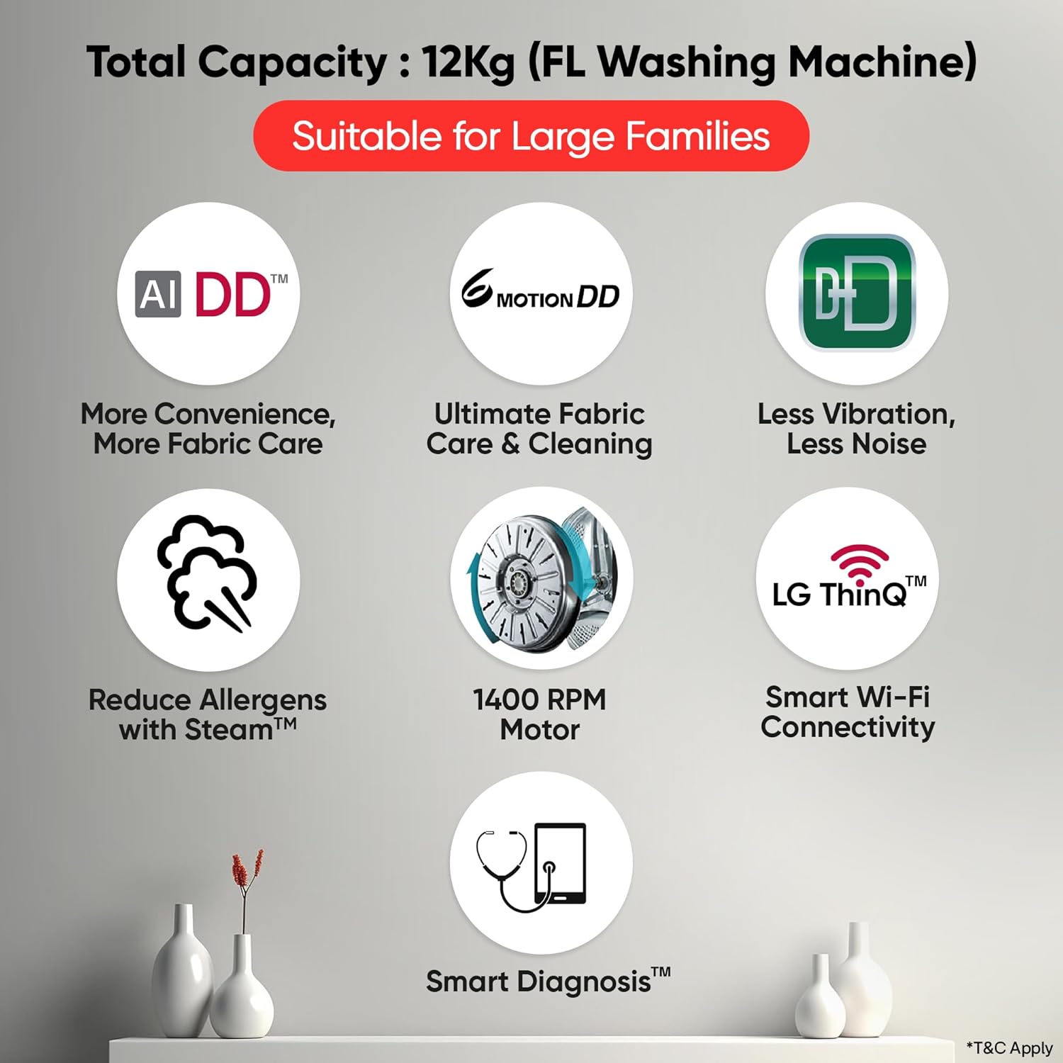 Key Performance Features: AI Direct Drive – Intelligent & Convenient Fabric Care; Direct Drive Motor- Less vibration, less noise; 6 Motion Direct Drive- Optimal wash for different fabrics; Steam – Reduce germs & allergens with steam cycles | Bigger Drum – deigned to cater to the Indian need of washing big loads at once | LG ThinQ with Wi-Fi – control & monitor your washer anytime, from anywhere with just one app