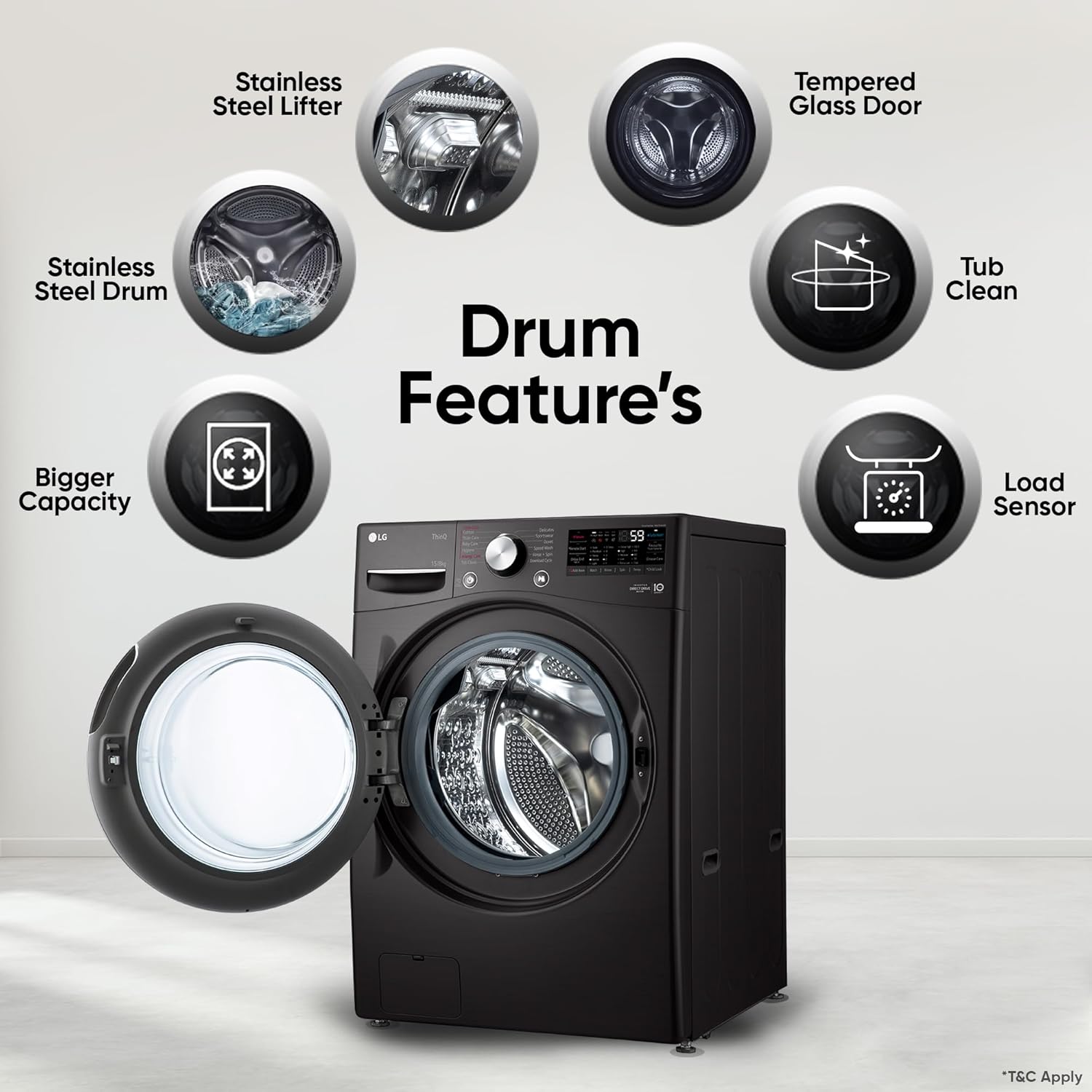 Drum / Pulsator type & Body material: Fully Stainless Steel Drum built to bring convenience and durability, which makes your washing machine last longer. Not just this, its stainless steel lifters keep the insides of washing machine hygienic | Material & Finish – Black VCM, Door Type – Black Tinted Tempered Glass Cover