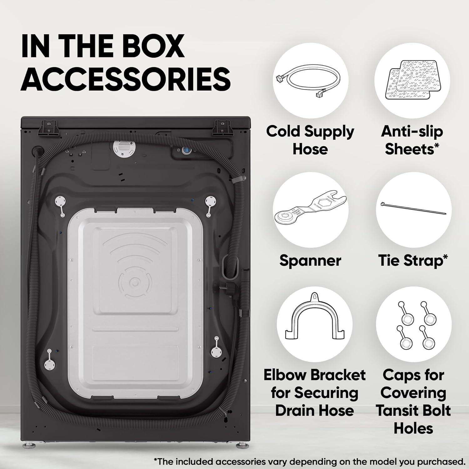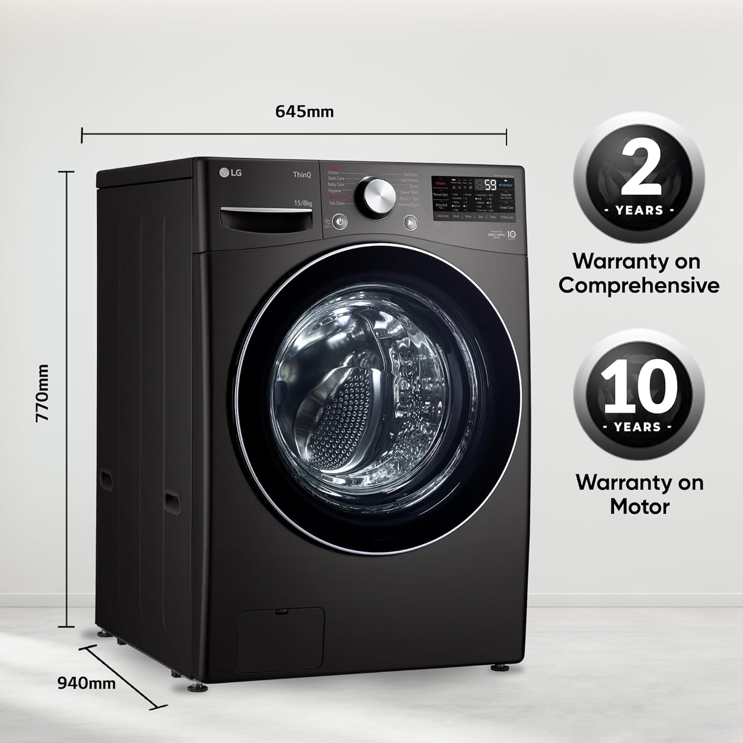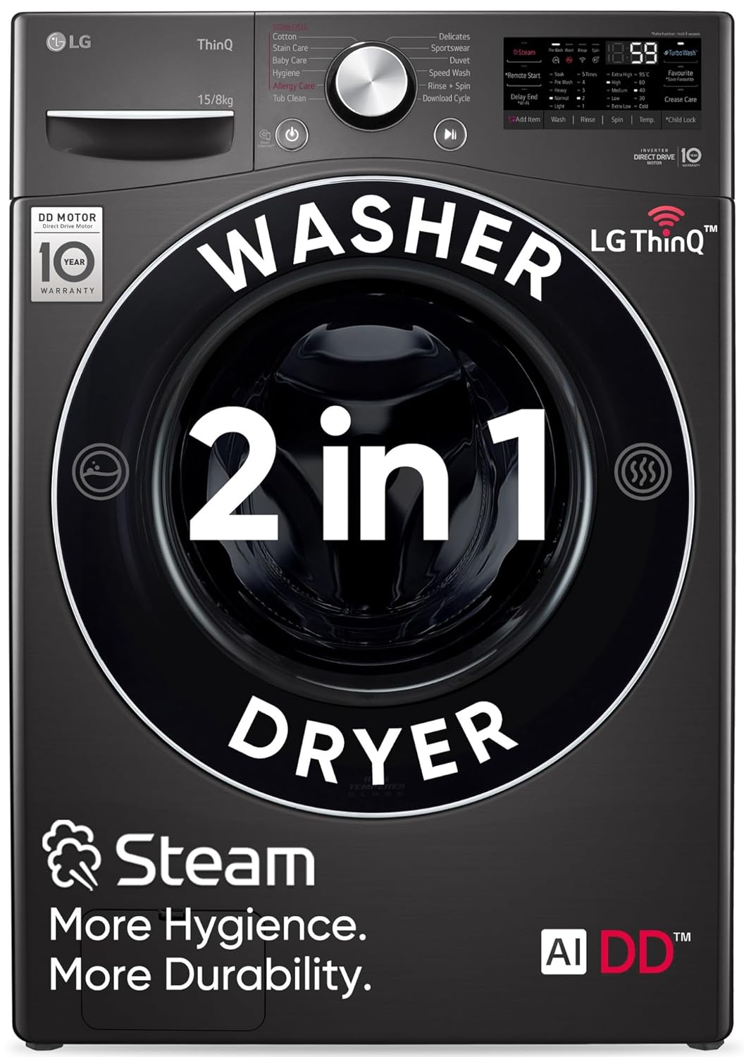 Key Performance Features: Bigger Capacity Washing Machine, AI DD: Intelligent Care with 18% More Fabric Protection, Inverter Direct Drive – Less Vibration, Less Noise, 6 Motion DD – Optimal Wash for fabrics, TurboWash 360˚ – Thoroughly Clean in 59 minutes, Steam+ – Less Wrinkles, More Hygienic, Washer and Dryer in One, More Energy Efficiency and Less Damage, Wi-Fi makes laundry much more convenient, Allergen reduced up to 99.9%* by Steam, Fabric care, Intensive stain removal, Silent operation