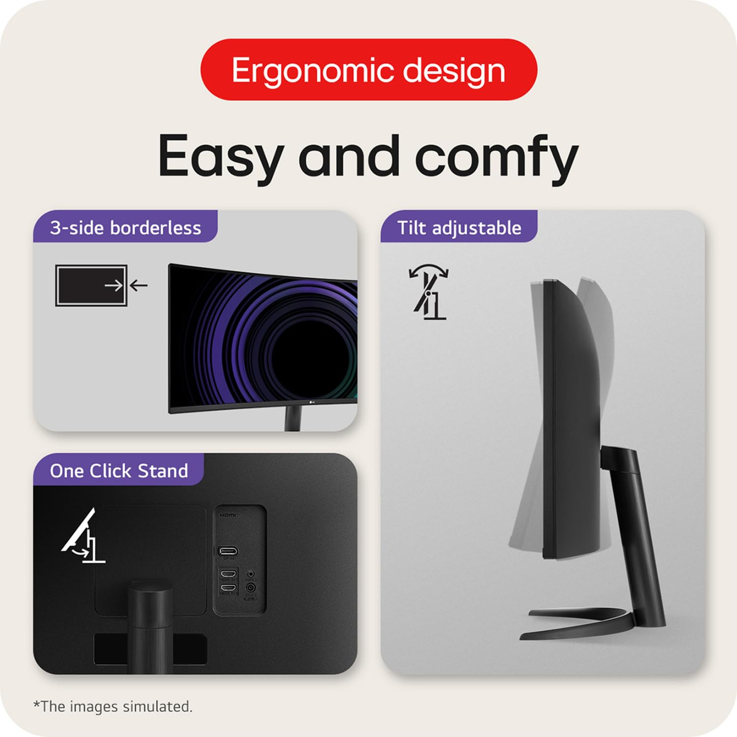 Easy and comfy: Achieve optimal positioning with the Ergonomic Stand: Simple setting with one click as well as easily adjust Tilt for your ideal viewing experience.