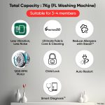 Fully-automatic front load washing machine with Hygiene Steam/direct-drive technology: Best Wash Quality, Energy and Water efficient Capacity 7 kg: Suitable for 3 – 4 members | Inlet water pressure must be between 50 kPa and 800 kPa Energy Star rating: 5 Star best in class efficiency; Energy consumption – 0.06 KWh/kg/cycle & Water Consumption: 8.6 L/Kg/Cycle (Please refer BEE label for more information) Manufacturer Warranty: 2 Years Comprehensive & 10 Years on Motor (T&C Apply) 1200 RPM: higher spin speeds helps in faster drying | Spin Speed options (Washer): No spin/400/600/800/1000/1200 10 Wash Program: Cotton – designed for normally soiled cotton clothes | Cotton Large – provides optimised washing performance for a large amount of laundry | Mixed Fabric – cleans a variety of different fabrics at the same time | Quick 30 – best for small loads of lightly soiled clothing| Allergy Care –This mode helps to remove allergens such as house mites, pollen and cat fur | Activewear – suitable for sportswear such as jogging clothes | Hand / Wool – suitable for lacy knickers or that silk blouse | Delicates – suitable for undergarments and delicate fabrics | Tub Clean: keeping your wash drum clean | Rinse+Spin: Rinses and spins clothes. Use fabric softener if needed Drum / Pulsator type & Body material: Fully Stainless Steel Drum built to bring convenience and durability, this stainless steel drum makes your washing machine last longer. Not just this, its stainless steel lifter keeps the insides of the washing machine hygienic | Body Material – Steel Display Type and Pressure Suitability: LED Display – Easy-to read information about wash cycles, remaining time display and other settings | User Friendly interface, enhancing convenience and control for users | Modern and sleek designs | Pressure Suitability: 50 kPa ~ 800 kPa (0.5 ~ 8.0 kgf/cm²) Key Performance Features: LG Inverter Direct Drive Technology- The drum and motor are connected directly which leads to less noise & vibration and, more durability | 6 Motion Direct Drive – optimised motion combinations for each fabric type | Steam: Allergen reduced up to 99.9%*| Tub Clean: To clean inner & outer tub for preventing unpleasant smell of tub | Auto Restart: allows the program to restart all by itself in case of power failure | Smart Diagnosis: helps you quickly troubleshoot almost any minor issue before it becomes a bigger problem | Silent operation Additional Features: LoadSense, Auto water level, Temp. Range – Cold/20/30/40/60/95℃, Crease Care, Shock Proof, Silent operation, Tempered Glass Door, Foam sensing & removal, Auto Balance, Child Lock, Beeper On/Off, Time Delay, Program Step indicator, Start/Pause Indication, Door Lock Indication, Error Message Indication, Error Message Alarm, Adjustable Leg, Material – Polyproplene