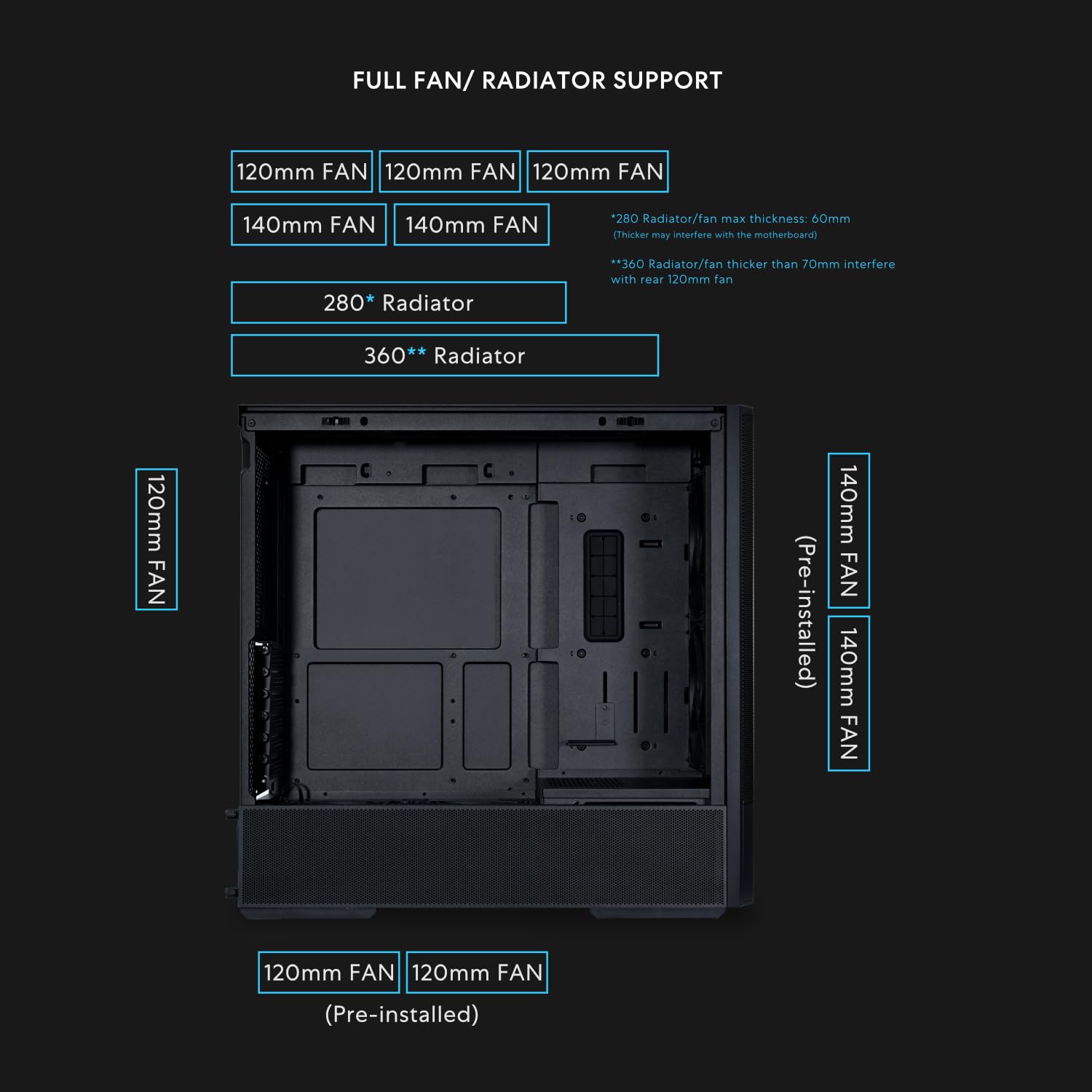 FAN SUPPORT :Top: 120mm x 3 or 140mm x 2, PSU Shroud: 120mm x 2 , Front: 140mm x 2 , Rear: 120mm x 1
