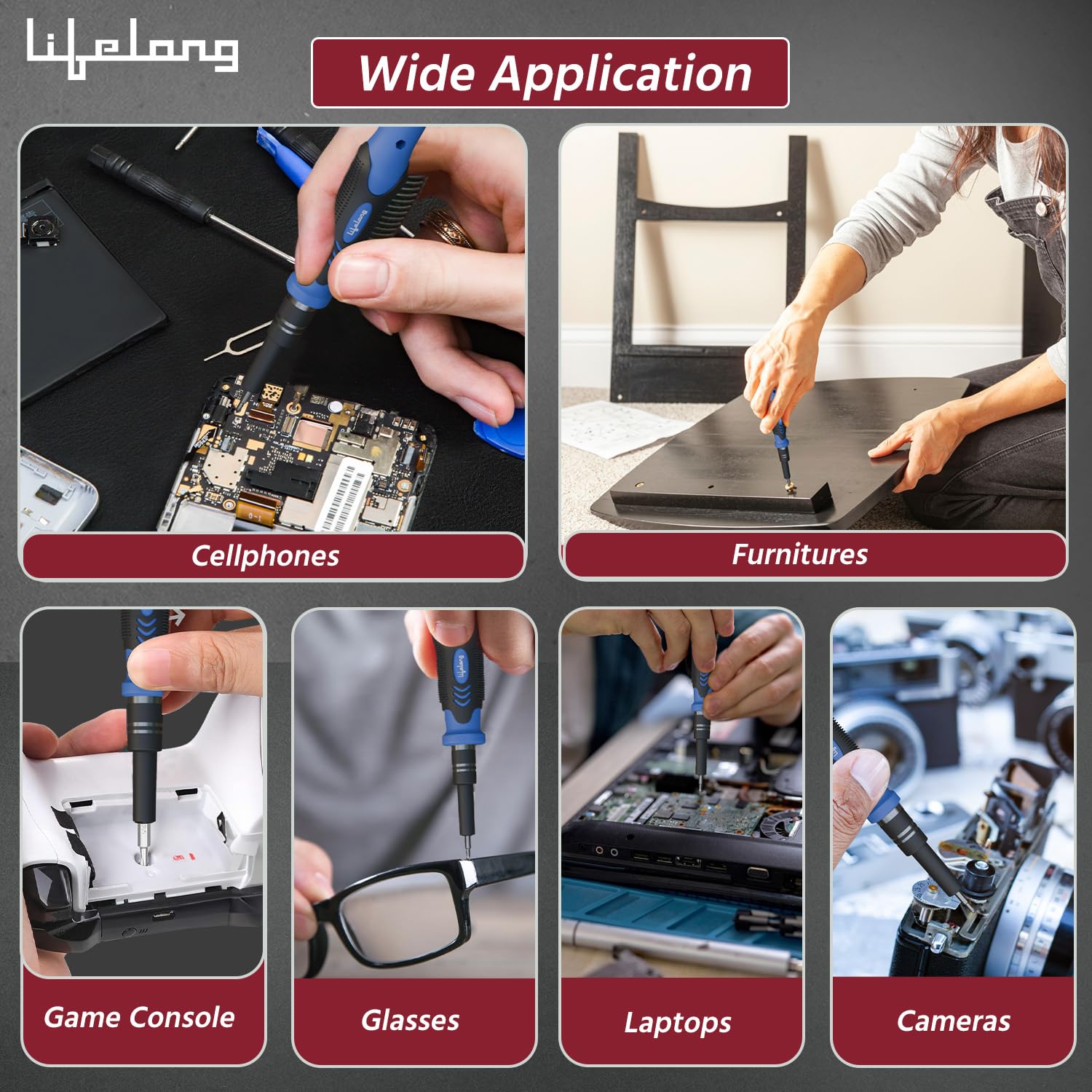A professional repair tool kit for smartphones (including iPhone), tablets (including iPad), laptops (including MacBook), cameras, game consoles, PS4/Xbox controller, watches, glasses, and other gadgets or furniture is included in the all-in-one precision screwdriver set.