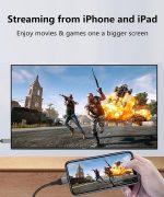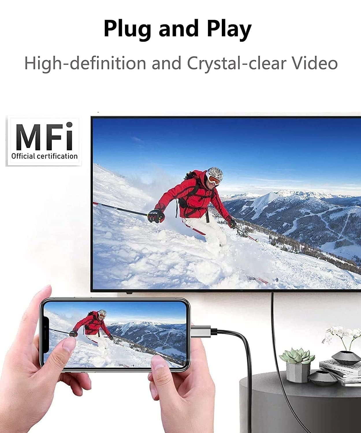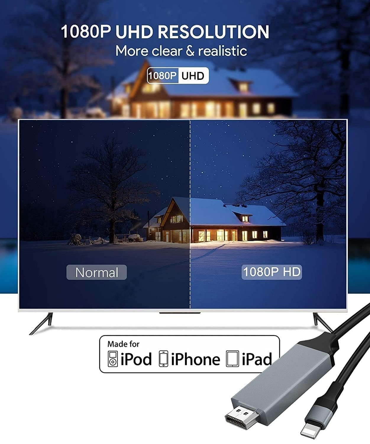 Lightning to HDMI Adapter for Select iPhone iPad and iPod Models on HD TV Monitor Projector – NO Need Power Supply (6.6 Feet) Why Choose iPhone Lightning to HDMI Adapter, No Error Message Pops Up Ultra-High Definition Stream media or extend your lightning device screen to a large monitor or TV in resolutions up to 2K at 60Hz Plug and Play No Need Install Any Driver/App & Personal Hot spot or WIFI,No Need to adjust the Mirror of iPhone/iPad Universal Compatibility Designed to work with virtually any Lightning or HDMI device including iPhone,iPad and iPod Touch. Support All iOS Reliable & More Durable Slimline and convenience, with user-friendly non-slip design for easier plug and unplug.TPE cable for extra durability No Power Supply Required Connect to your device and start using immediately, with no need for installation. No need hdmi cable and charging cable & adapter Cast small to big screen The hdmi cable for iphone to tv is perfect for watching movice,games,video,calls,TV shows,presentations or conferencing,expanding the workspace by connecting your devices to a large screen.Protect your eyes.