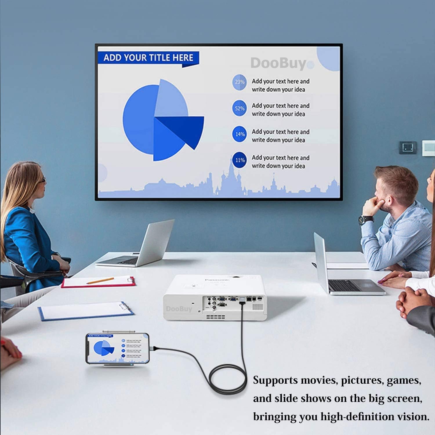 3.Support all formats of audio, video and picture. Support audio/video/picture in the Phone Pad convert into HD digital signal to all devices with HDMI ports.