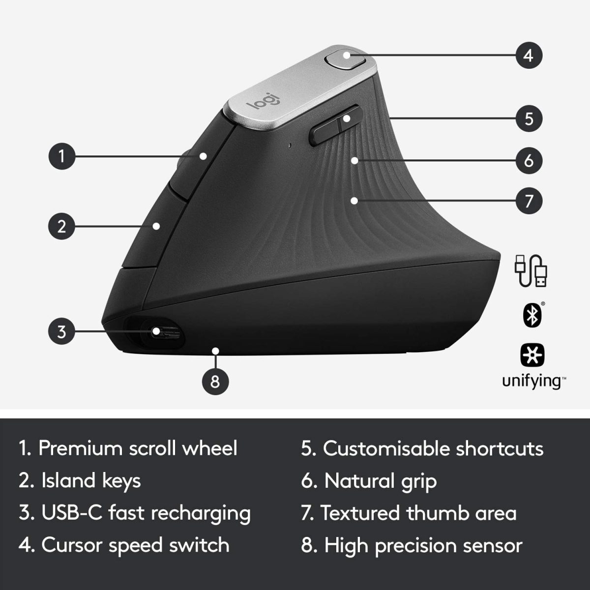 MX Vertical is shaped for the human hand and smooth to the touch. Its unique form is designed to fit a variety of hand shapes and sizes, while the textured rubber surface assures a solid and natural grip. Be confident MX Vertical will fit comfortably in your hand.