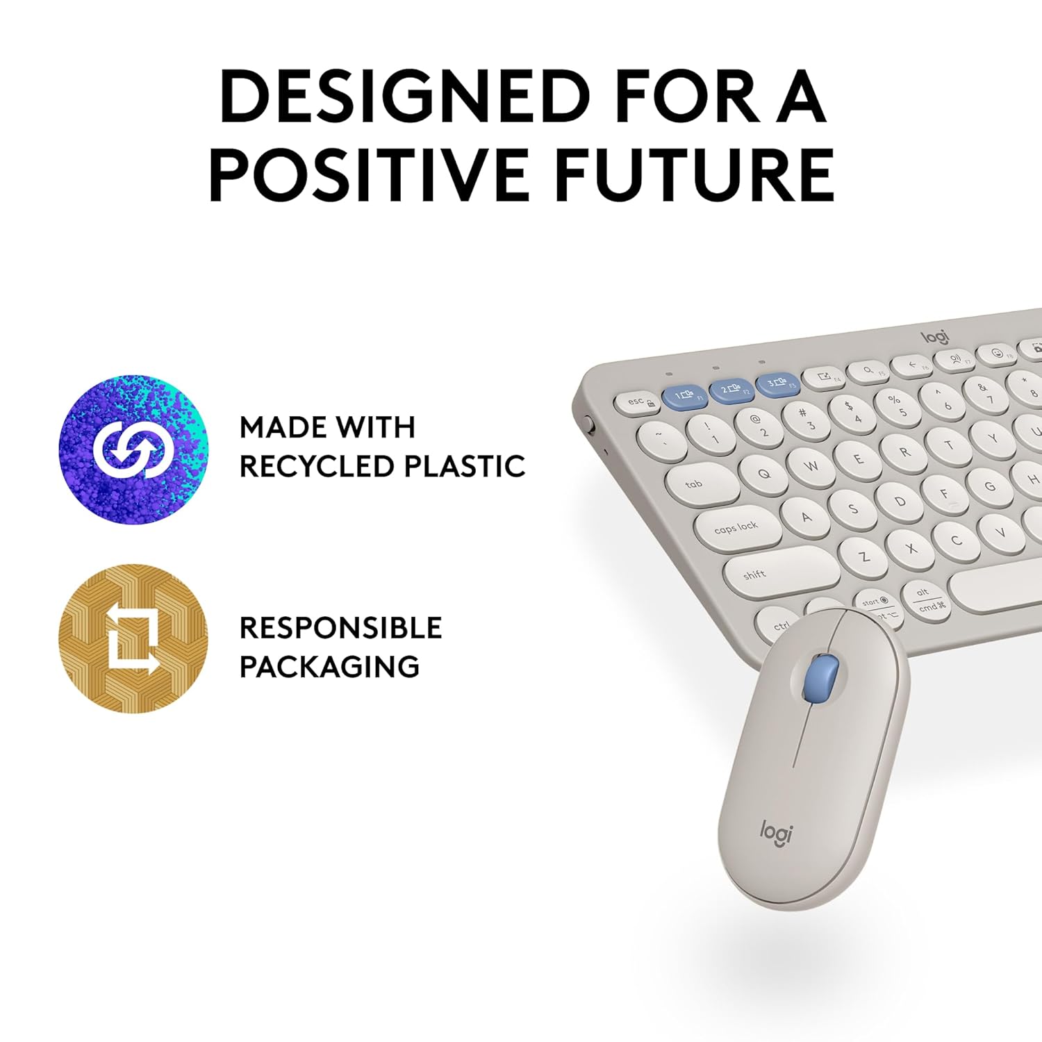 A Design Choice to Feel Good About: Plastic parts include certified post-consumer recycled plastic (1); Pebble Keys 2 K380s minimum 49% and Pebble Mouse 2 M350s minimum 58%