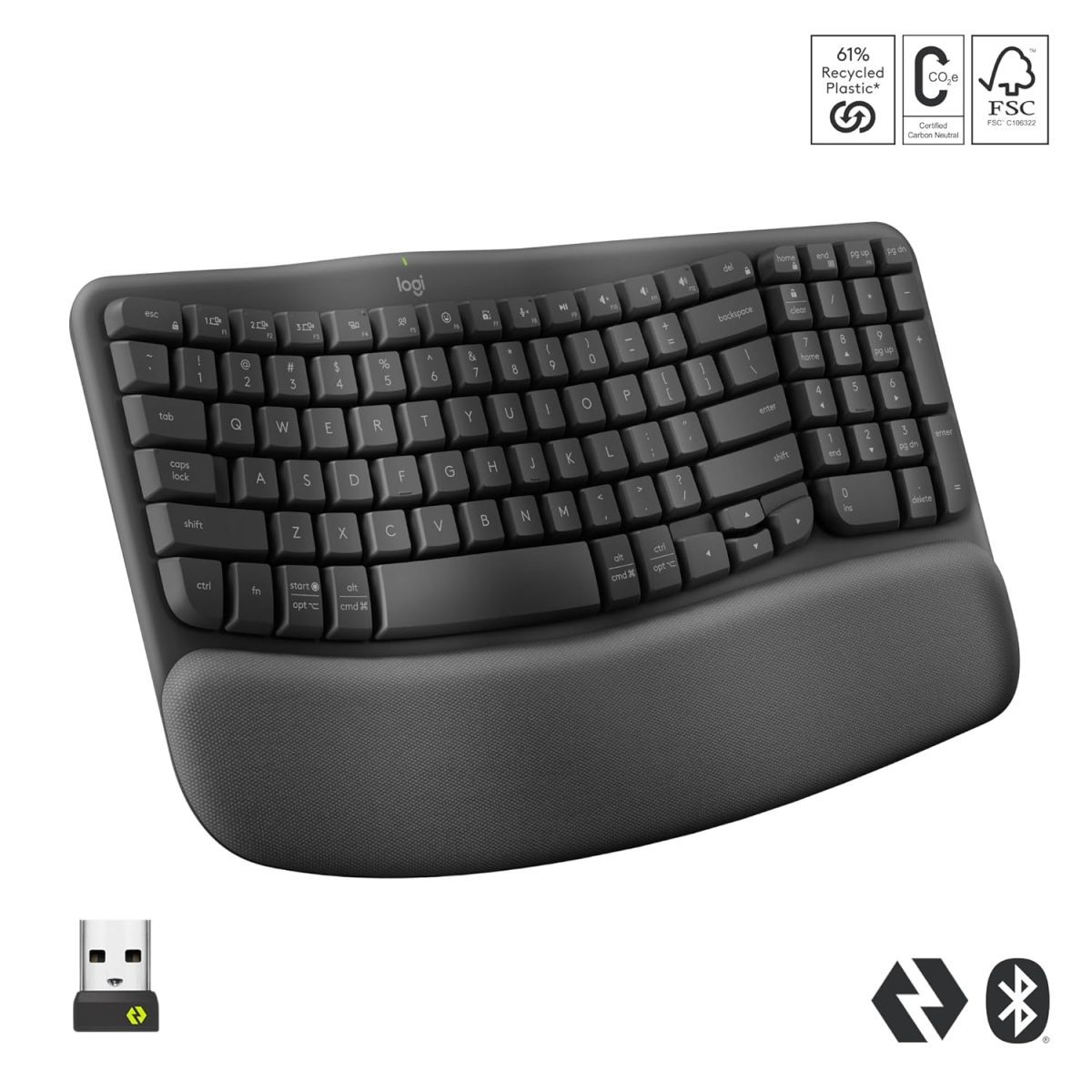 Feel the Wave: Get comfier with Wave Keys, the ergonomic wireless keyboard shaped to help workdays go easier on you Type in comfort all day long: The wavy design of this compact keyboard places your hands, wrists and forearms in a natural typing position More palm support, less pressure: A cushioned palm rest with memory foam supports you all day long and gives you more wrist support (1) Smoother days, your way: Personalise your Wave Keys experience using the Logi Options+ App, where you can choose shortcuts that save time and keep your work flowing (2) Connect with Bluetooth or the Logi Bolt Receiver: Use Easy-Switch to switch between laptop, tablet and phone (compatible with Windows/macOS/iPadOS/ChromeOS); up to 3 years battery life (3)