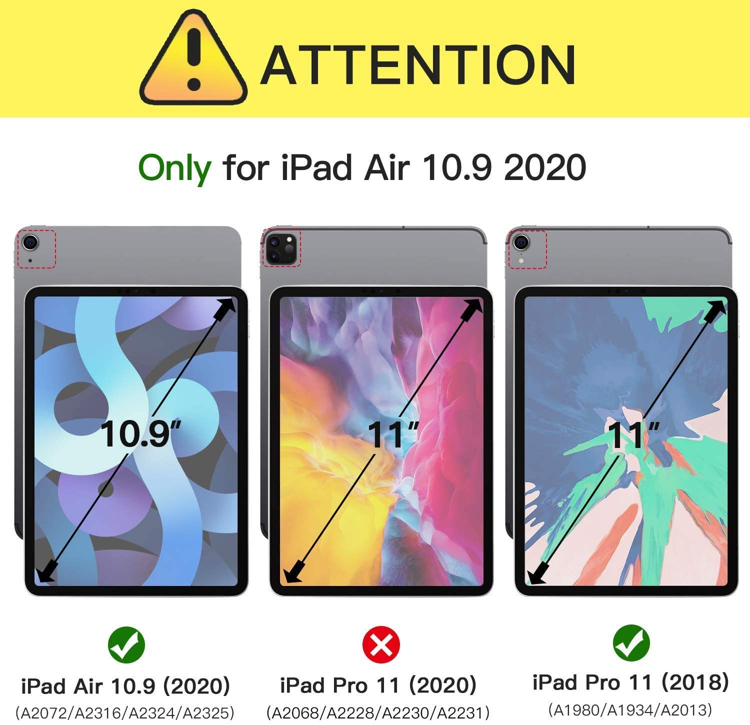 Specially Made for below models only: Model number (on back cover): A2316 on iPad Air (4th generation) A2324, A2325, A2072 on iPad Air (4th generation) Wi-Fi + Cellular