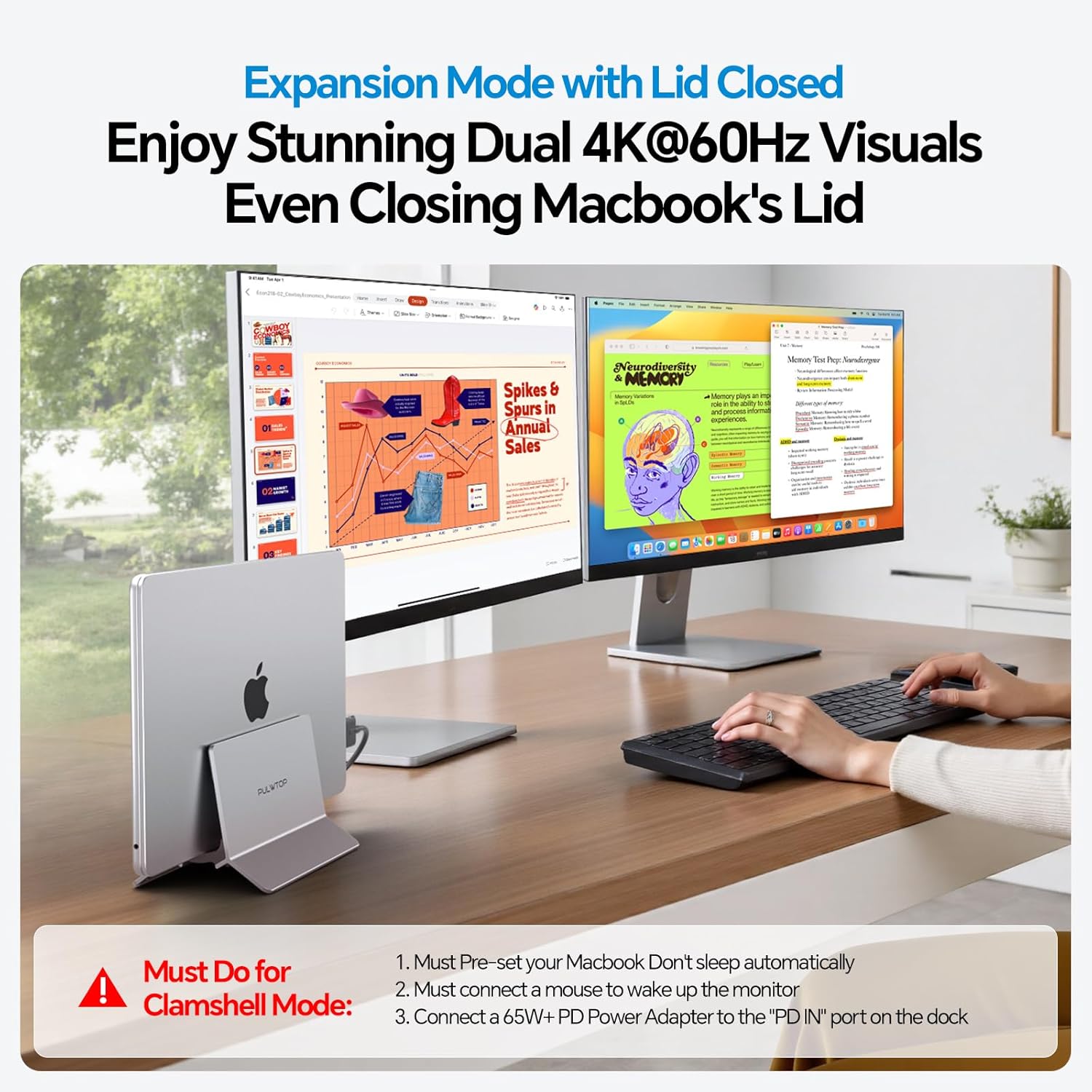 【11 in 1 Docking Station】: This docking station stand for Mac Docking Station comes with 2 x 4K@60Hz HDMI for HD video output, 1 *USB A 10Gbps, 2 *USB C 10Gbps, 1 *USB A 2.0, SD/Micro SD,100 Max PD IN, RJ45 wired Gigabit Ethernet.【Note: Please connect a power adapter (Not included) of 65W or above.】