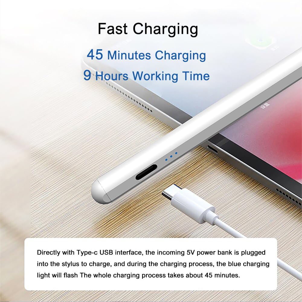 【MAXIMIZE PRODUCTIVITY WITH SMART FEATURES】: The touch pen boasts a powerful 130mAh lithium battery, known for its long-lasting performance, and it automatically enters sleep mode after 10 minutes of inactivity, conserving power. Charging via the Type-C port is swift, taking just 0.5-1 hour to recharge fully, getting you back to work or play in no time.